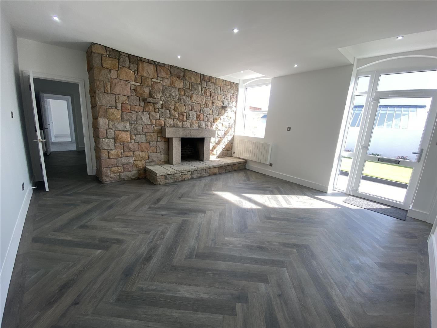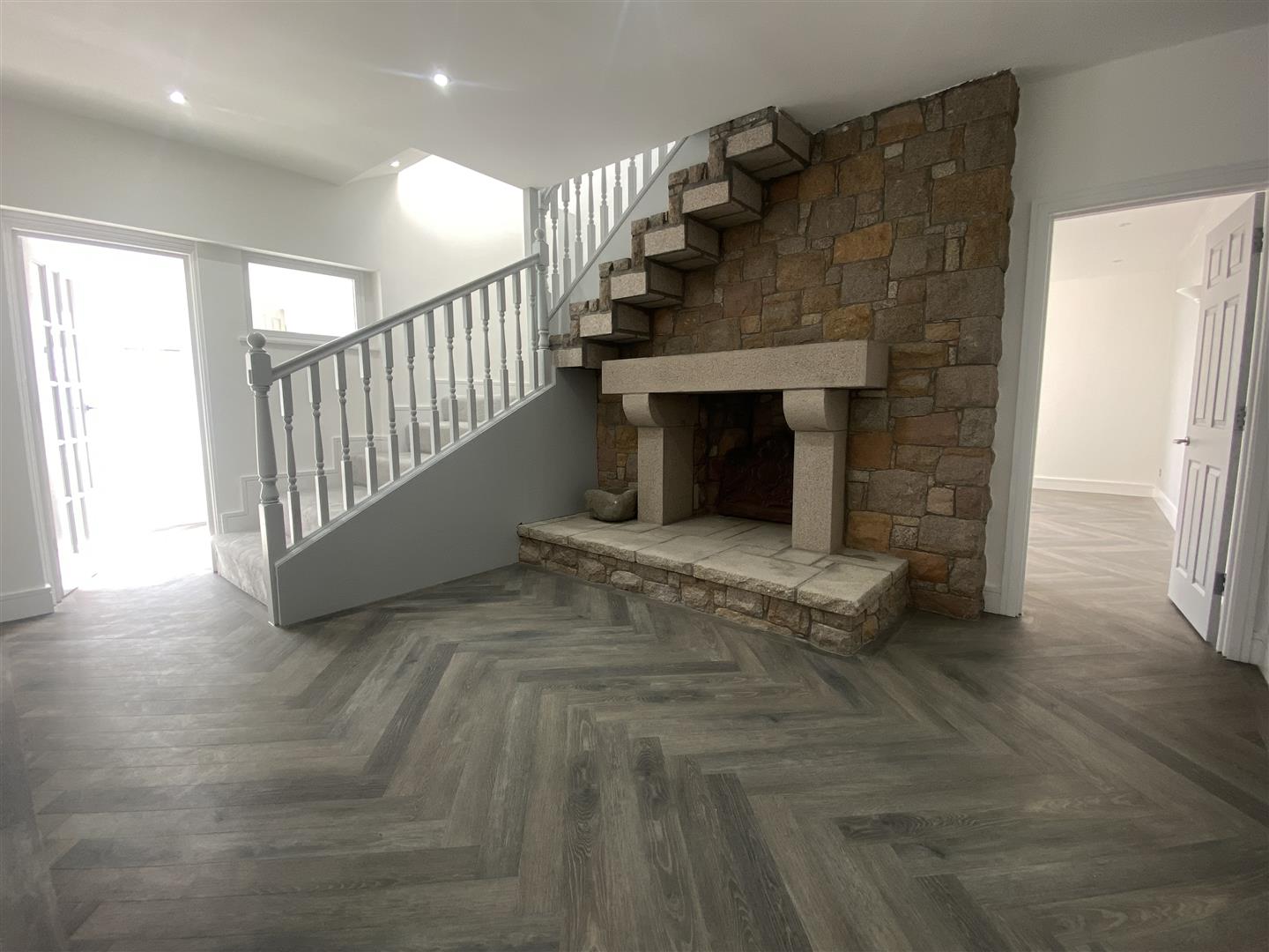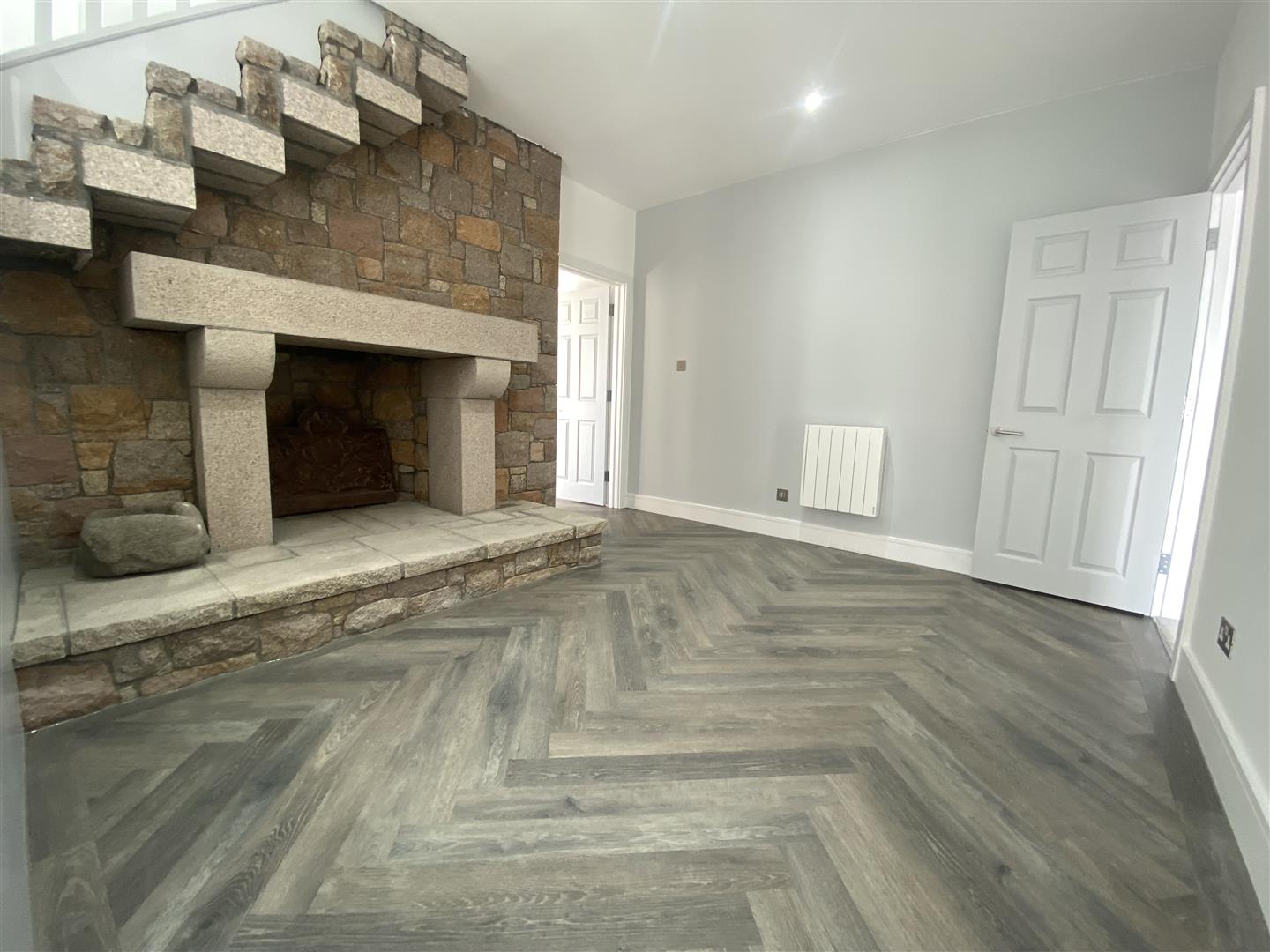 The ground floor offers a large welcoming entrance hall with a striking granite feature fireplace which continues into a reception room proving a softening cosy atmosphere with a working fire centre piece. Continuing at ground level there are two double bedrooms, one of which offering views over St. Helier and an ensuite connected to what could be a walk-in wardrobe.