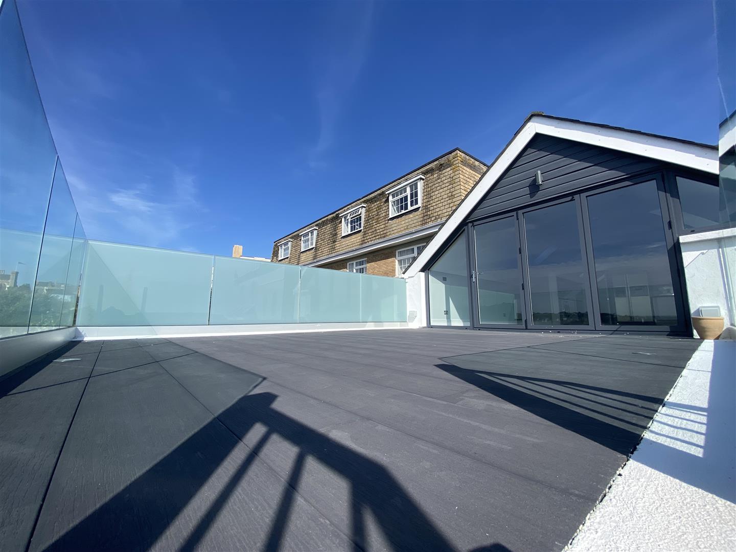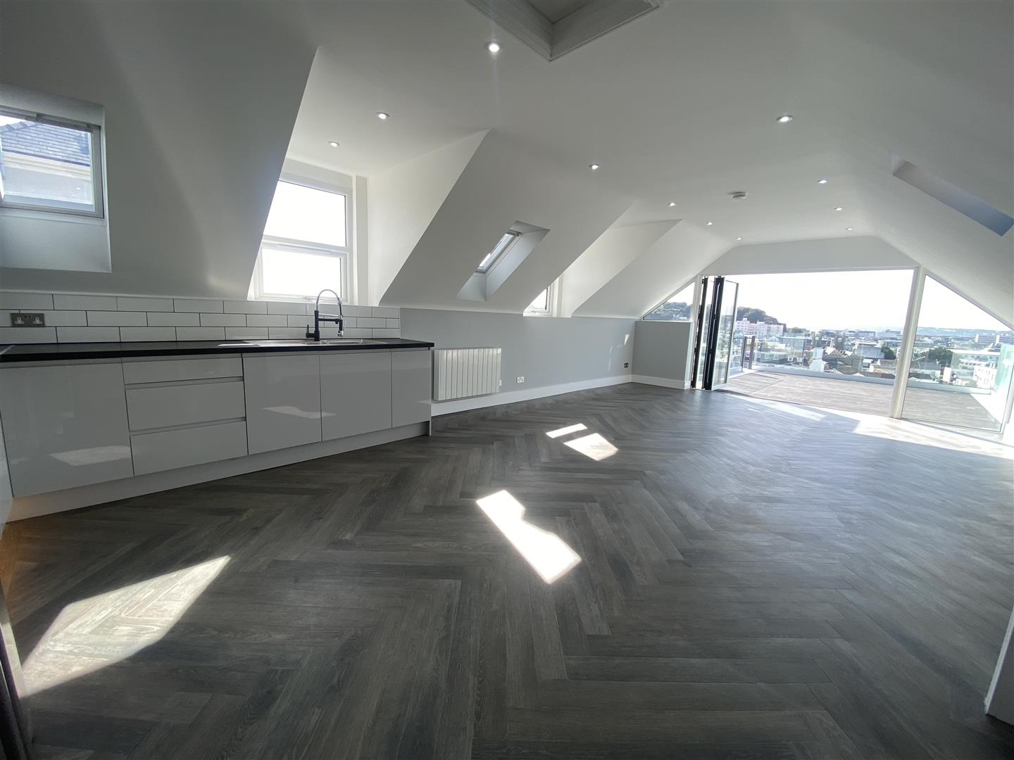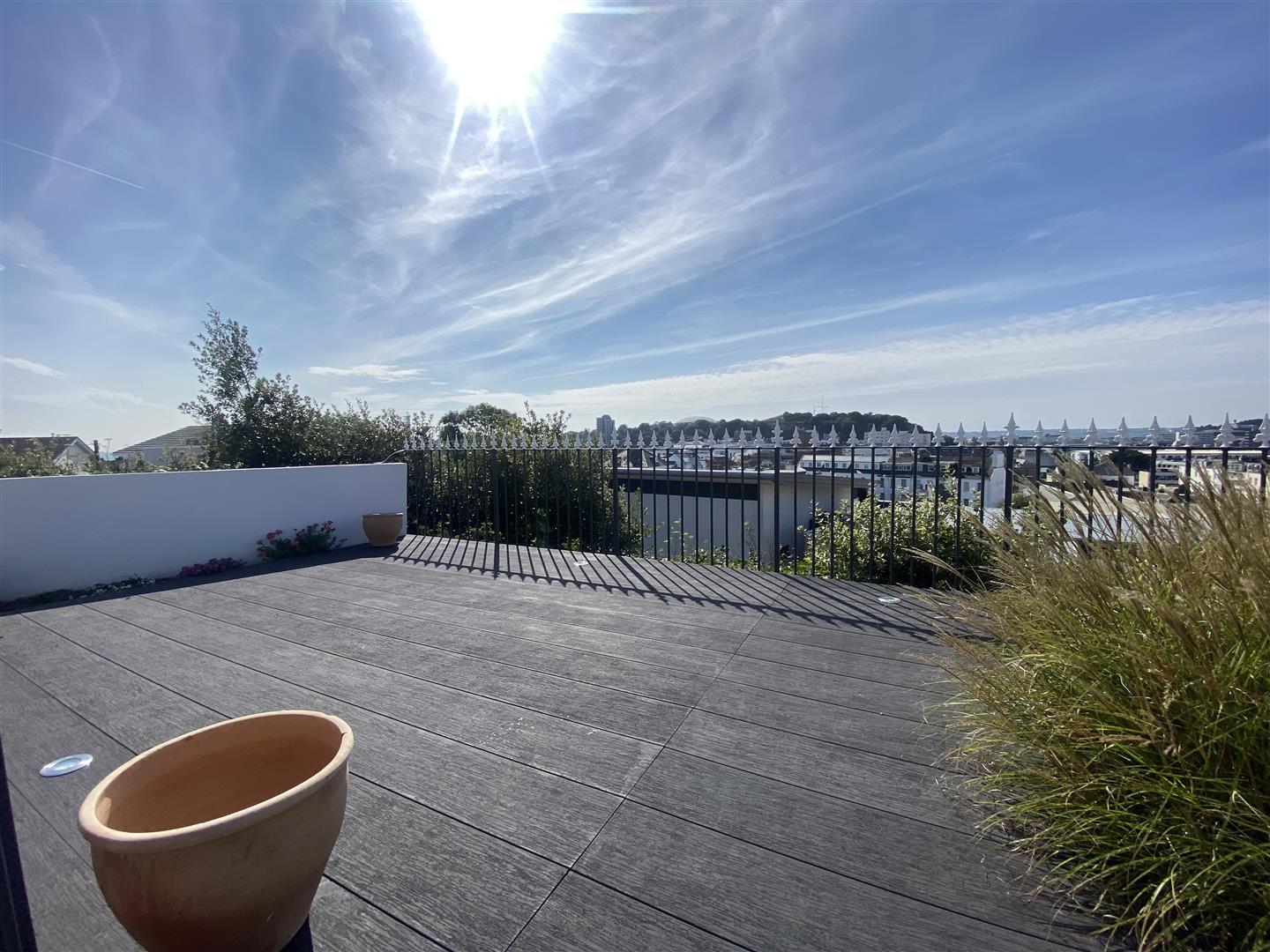Upstairs can be accessed from both downstairs and from the South-West facing spacious sun terrace and comprises; kitchen/lounge/diner with large bi-folding doors offering access to the sun terrace, two additional double bedrooms and a modern bathroom.