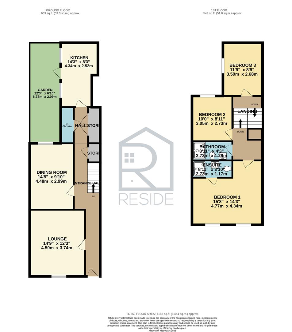 The downstairs of the property briefly comprises entrance hall, 2 spacious reception rooms, separate kitchen with access onto the garden, WC and storage. Upstairs there are 3 double bedrooms, with the principle bedroom being ensuite and house bathroom.