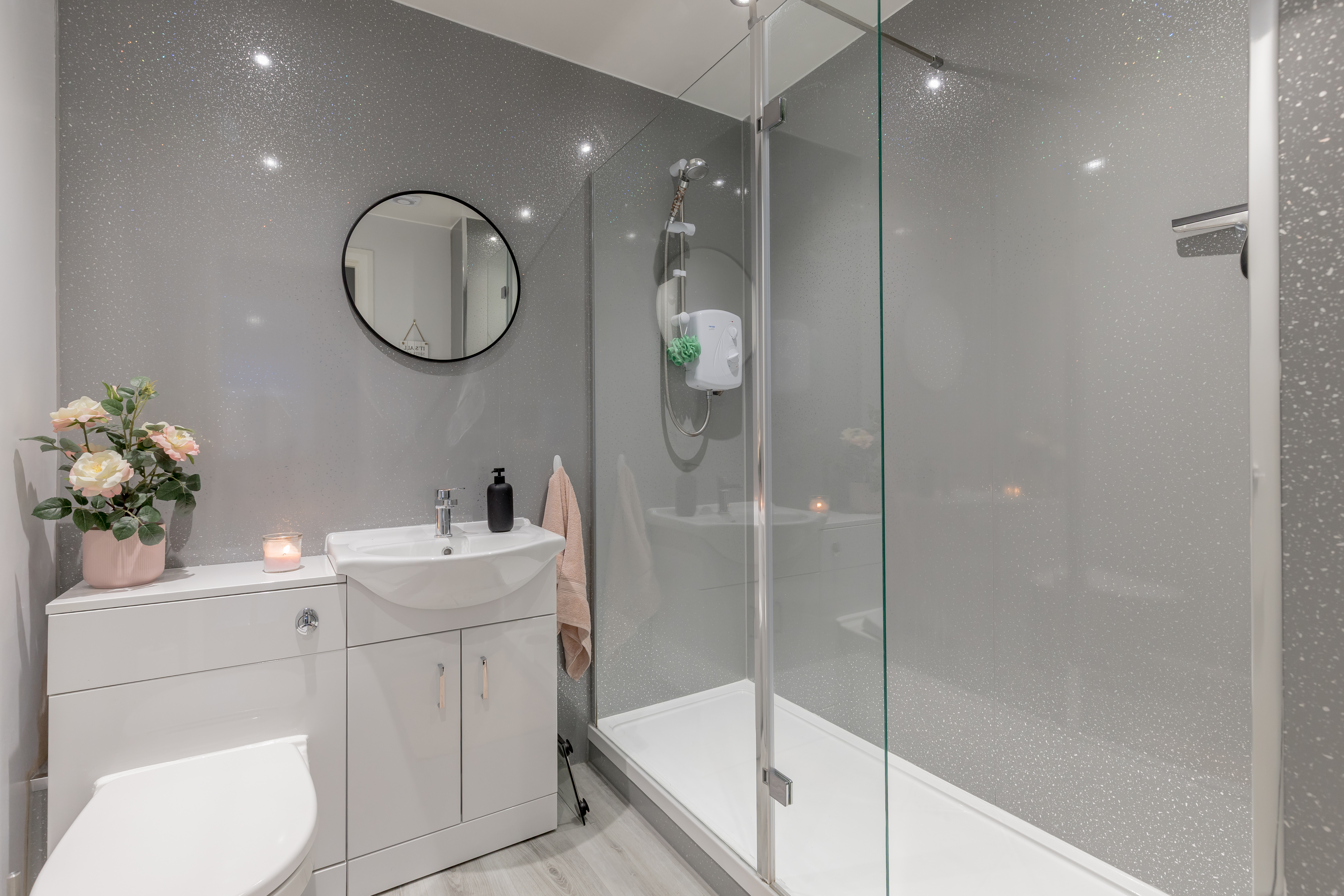 The spacious dual-aspect living and dining room provides the perfect setting for entertaining friends and family. The modern kitchen is fitted with a stylish range of floor and wall-mounted units, induction hob, electric oven, and integrated appliances. Both bedrooms are generous doubles, each benefiting from fitted wardrobes that provide ample storage. The contemporary shower room is finished with a sleek two-piece suite and a large electric shower. Further highlights include a sizeable utility cupboard with white goods included in the sale, efficient electric heating, and double glazing throughout. Externally, the property also boasts the convenience of off-street parking.