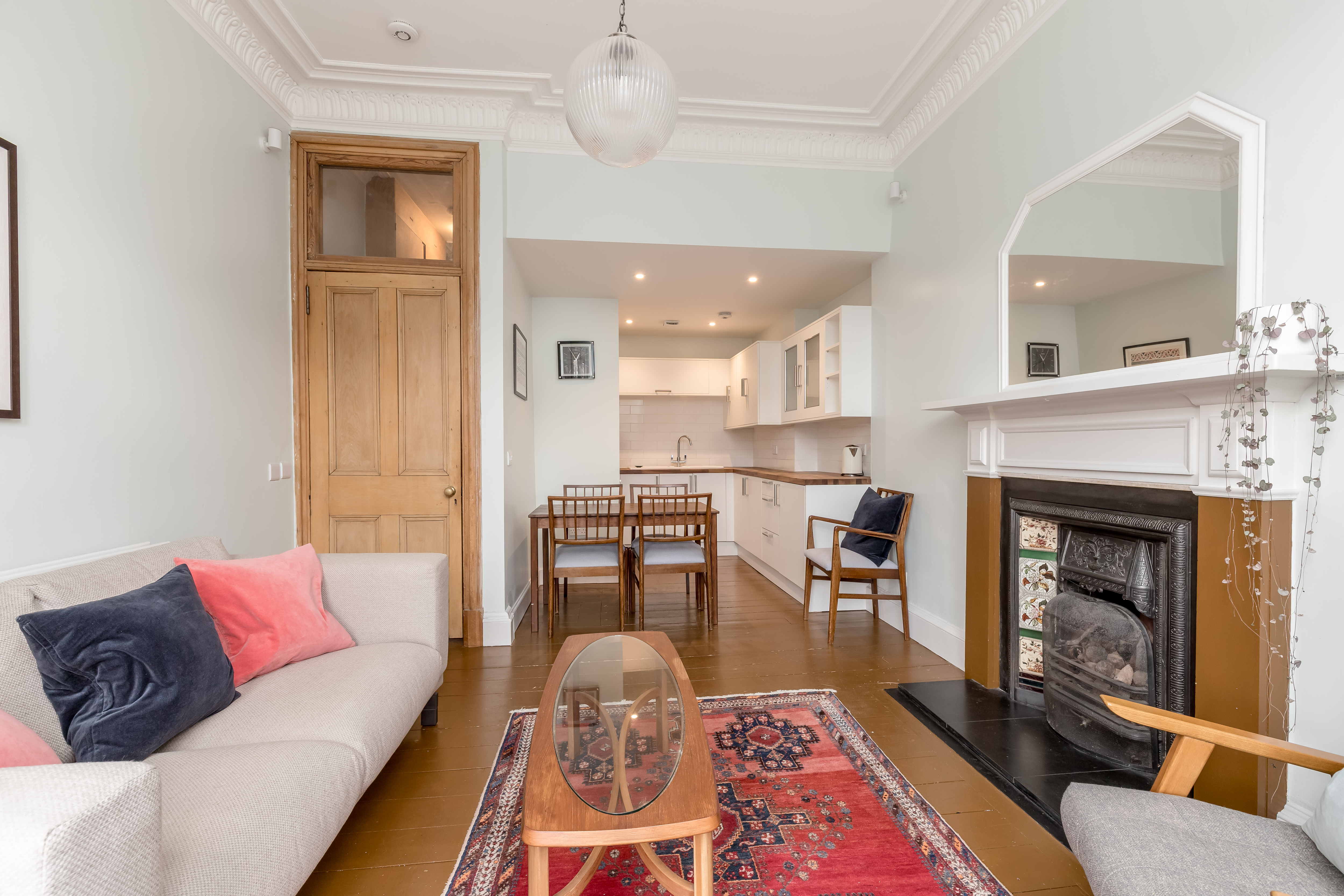 The property consists; welcoming entrance hallway with a convenient storage press, leading into a spacious and well-proportioned lounge/diner. This bright living space benefits from a large double window providing plenty of natural light, while period features such as ornate cornicing, centre rose, Edinburgh press, and a decorative fireplace add charm and character. The kitchen is well equipped with ample floor and wall mounted storage, an integrated electric oven and gas hob, and integrated fridge. There are two generous double bedrooms, both offering comfortable and flexible accommodation. The bathroom is fitted with a modern three-piece suite, including a rainwater mains shower over the bath. Additional benefits include gas central heating and double glazing throughout, ensuring energy efficiency. Externally the property benefits from well maintained communal gardens and residents permit parking. Please note no warranty is given for systems.
