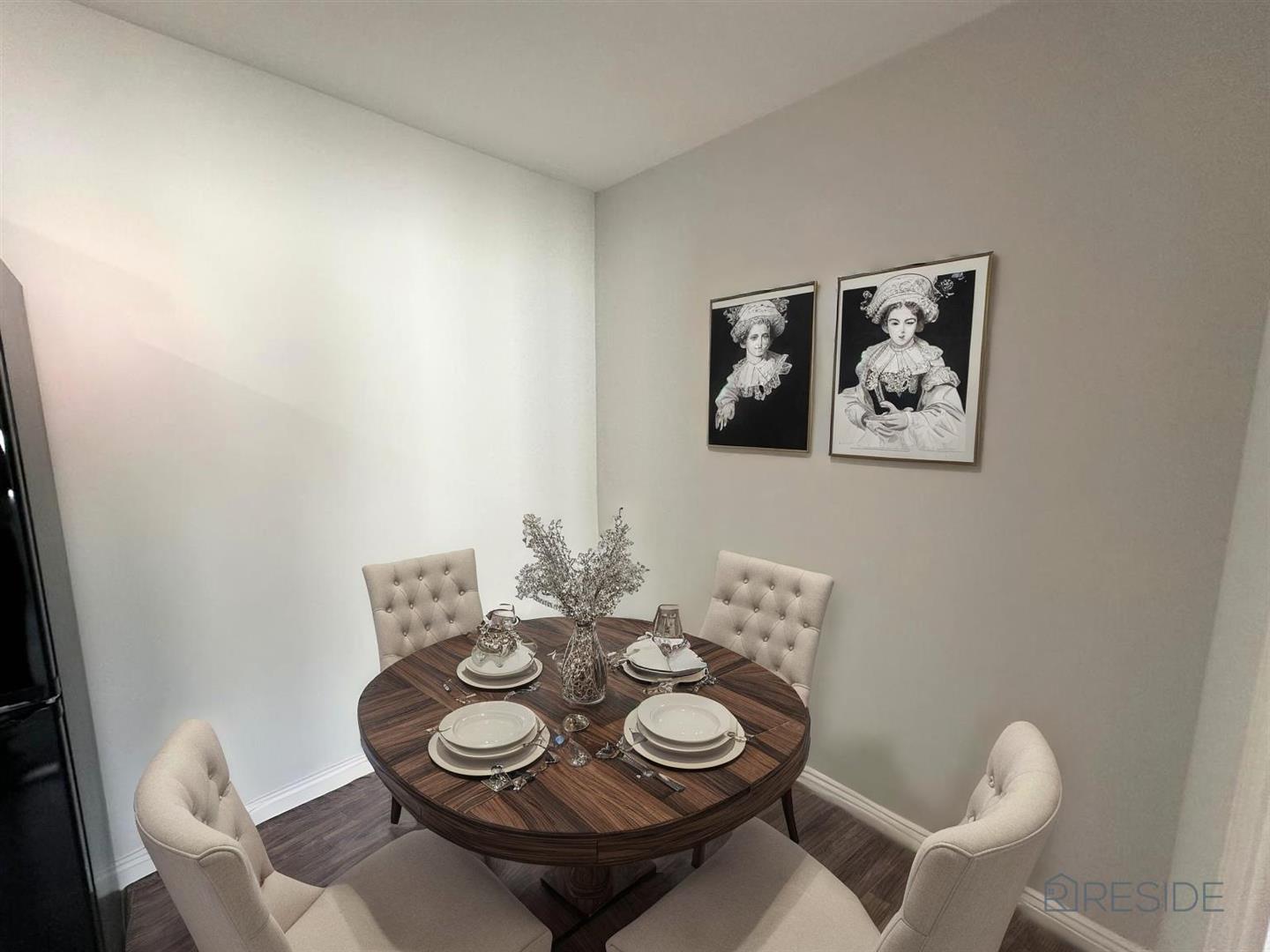 The apartment offers a spacious living area with a Juliette balcony, allowing for plenty of natural light. A modern kitchen adjoins a dedicated dining area, which can be opened up to create a seamless open-plan layout or closed off.