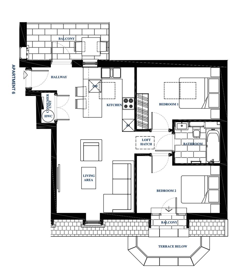 There are two generously sized bedrooms offering ample space with a built in wardrobe and doors to access a terrace. The modern bathroom is deisgned with Victorian style fixtures and fittings.