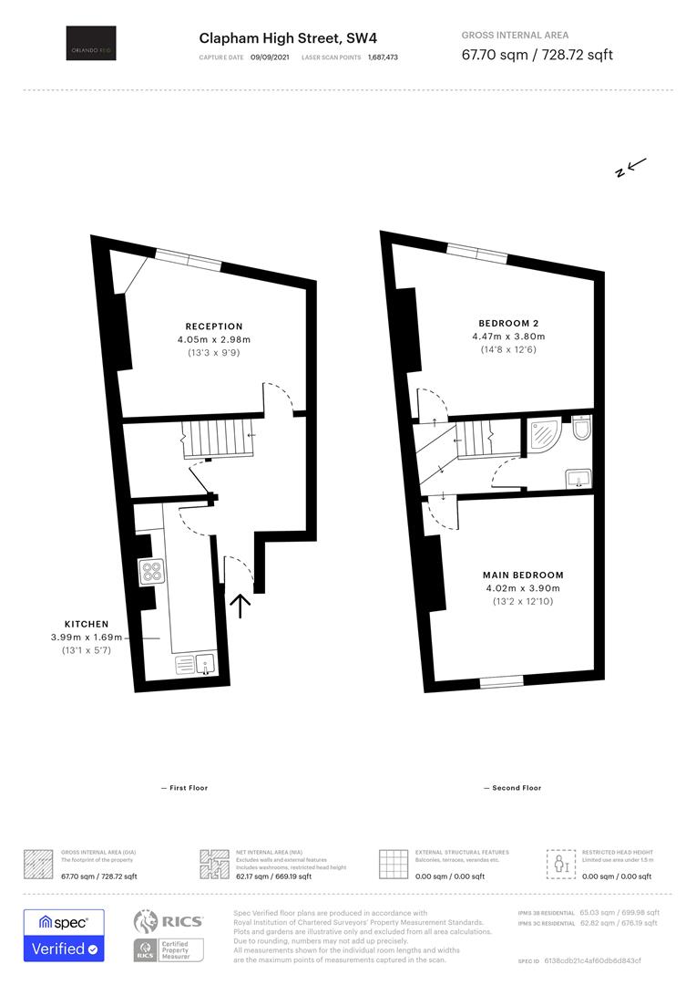 A split level, two double bedroom apartment located in the heart of Clapham High Street. In brief the property is comprised of: On the first floor is the kitchen and separate living room. On the second floor are two double bedrooms and the family bathroom. The internal living space spans around 728 sq ft.