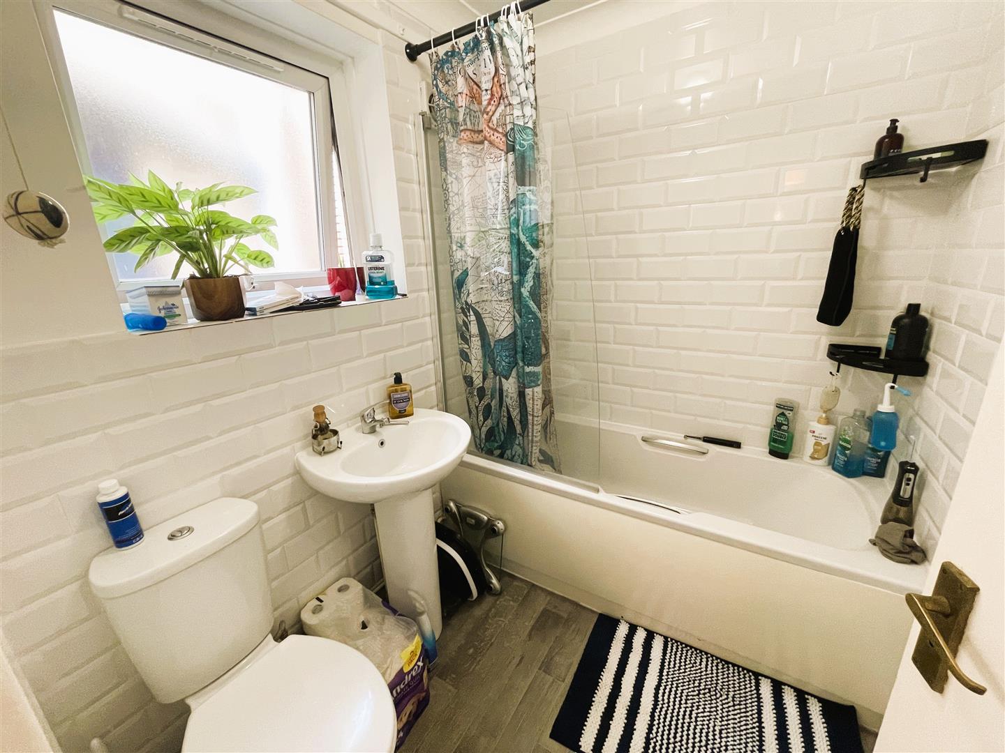 The modern three piece bathroom suite comprises a low level WC, pedestal wash hand basin, bath inset and wall mounted electric shower. It features tiling to principle areas, a wall mounted Dimplex heater, and a double glazed frosted window to front aspect.