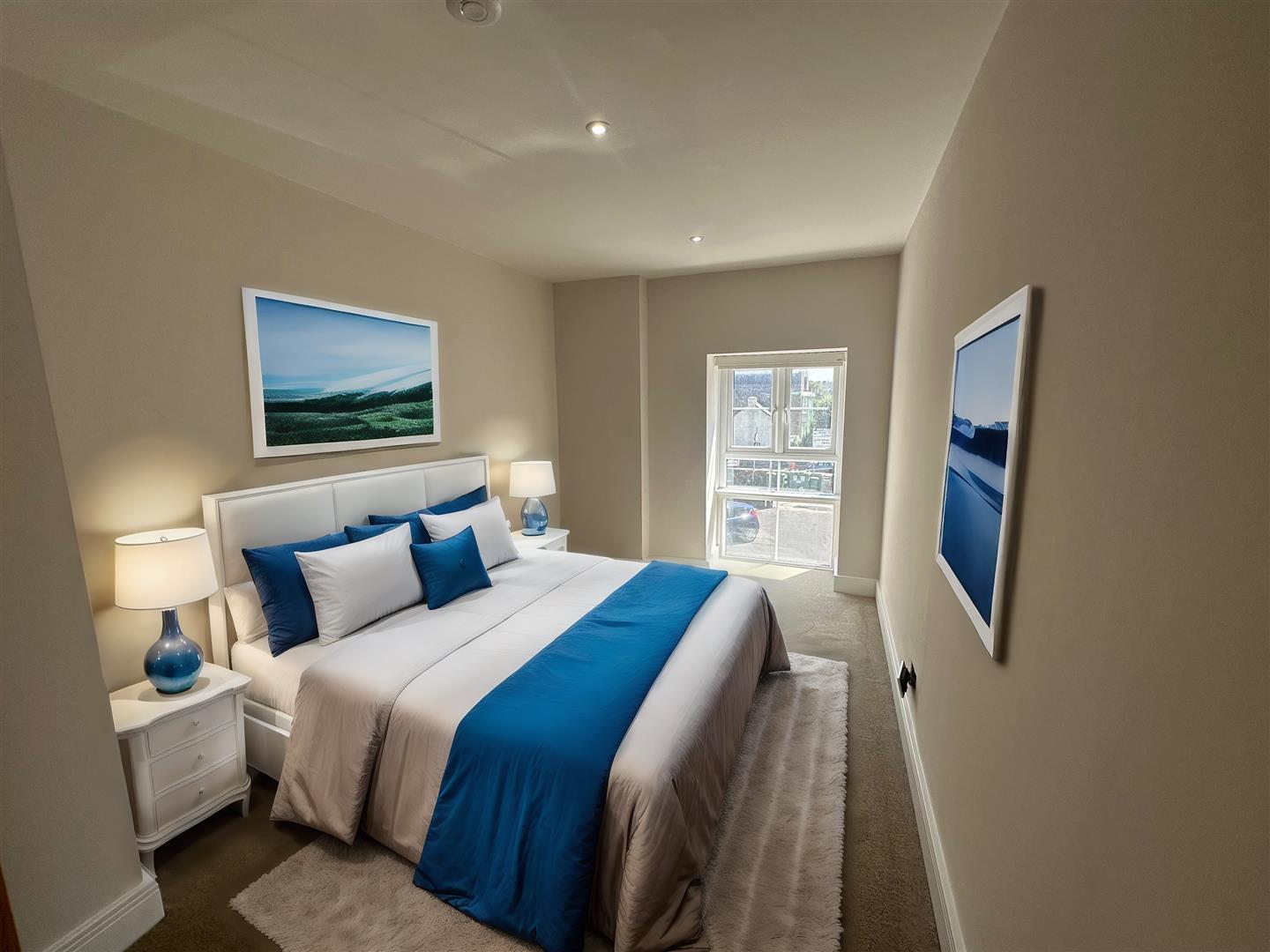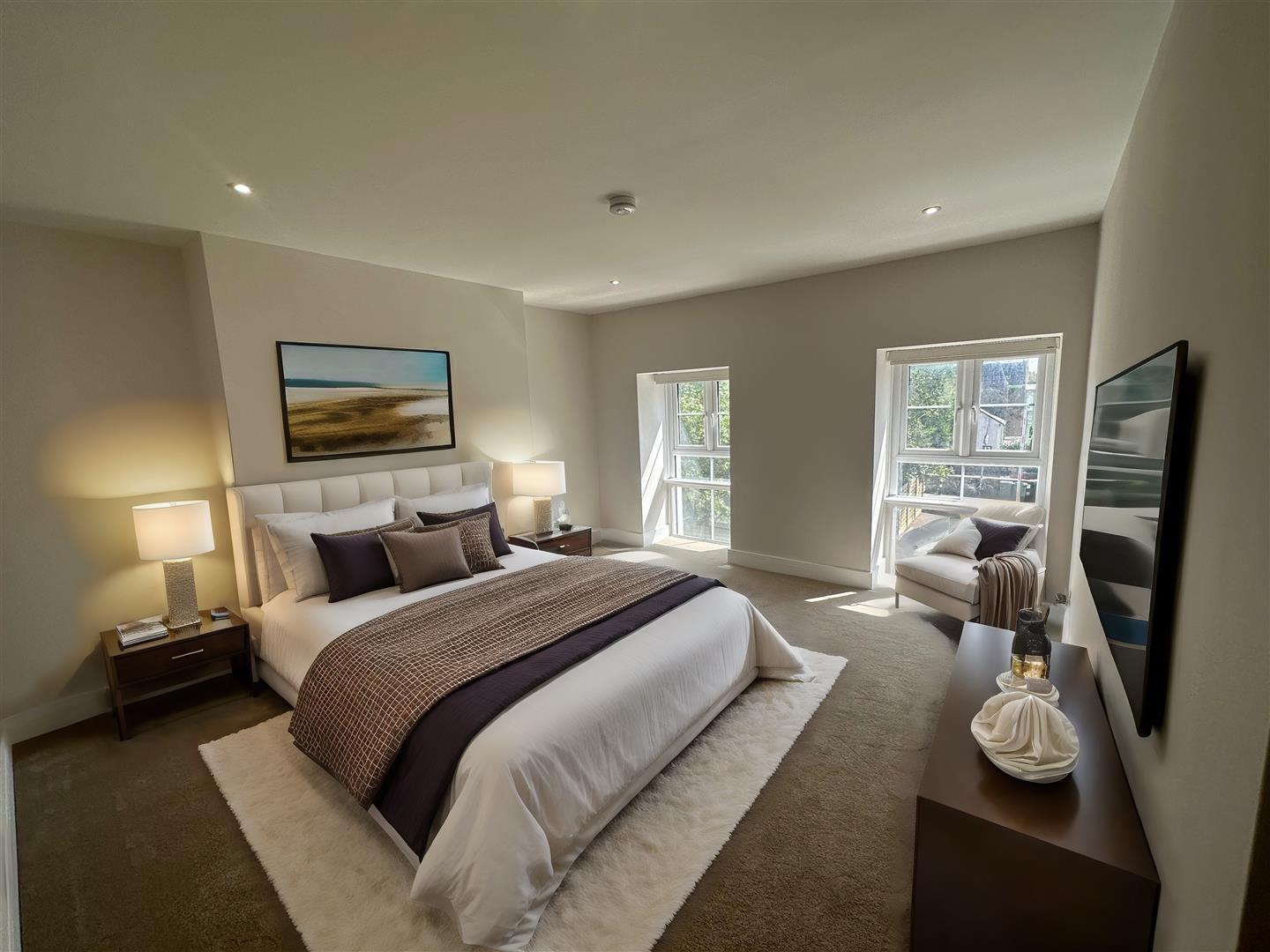 There are two double bedrooms, both complete with plush carpeting, ample space and large windows. The modern bathroom boasts a spa-like atmosphere with its contemporary fixtures, elegant tiling and a spacious walk-in shower.