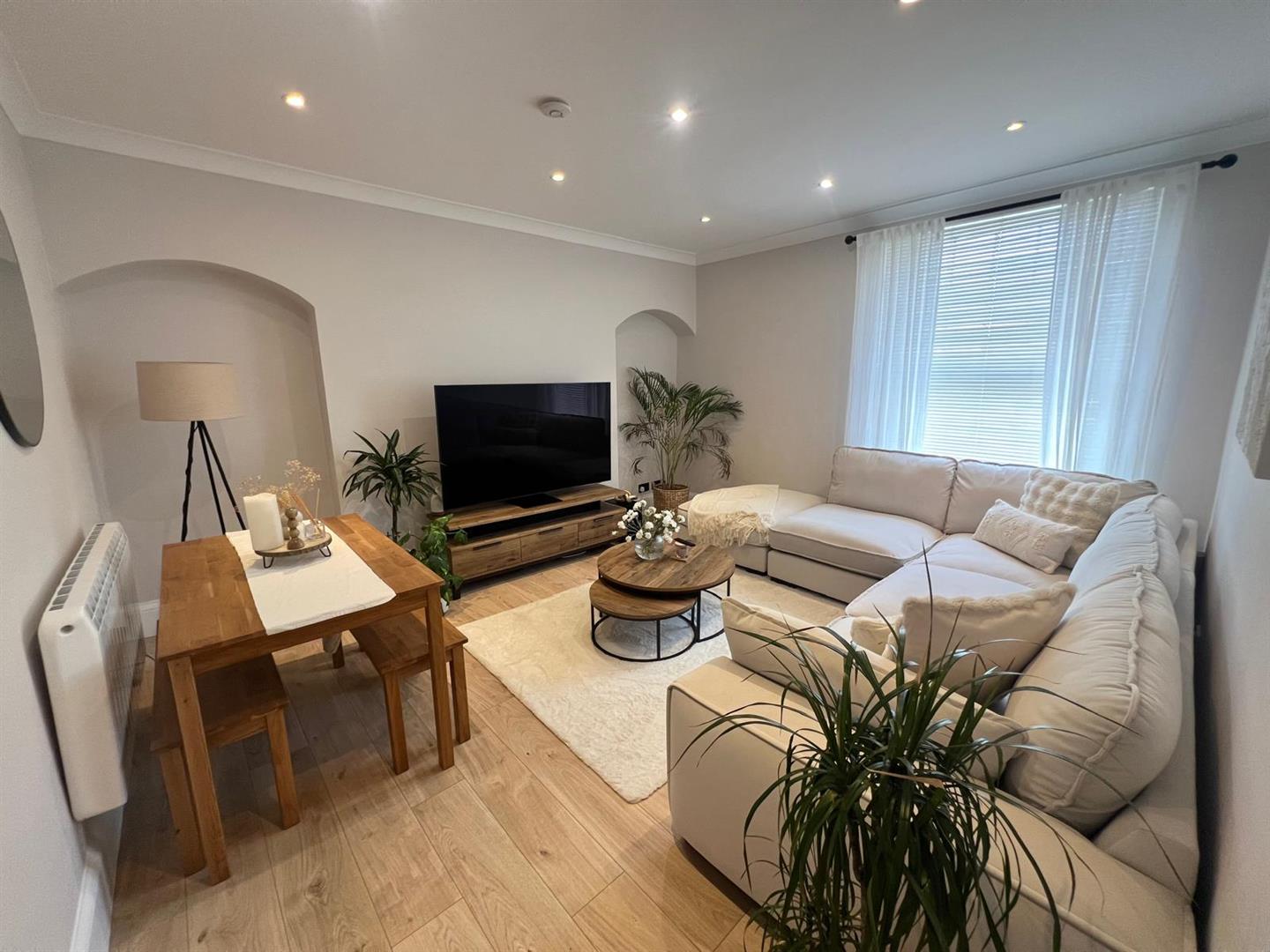Boasting high ceilings and large windows throughout, the property is filled with natural light, creating a warm and welcoming atmosphere. The apartment features a cosy yet spacious lounge/diner and a separate, modern kitchen.