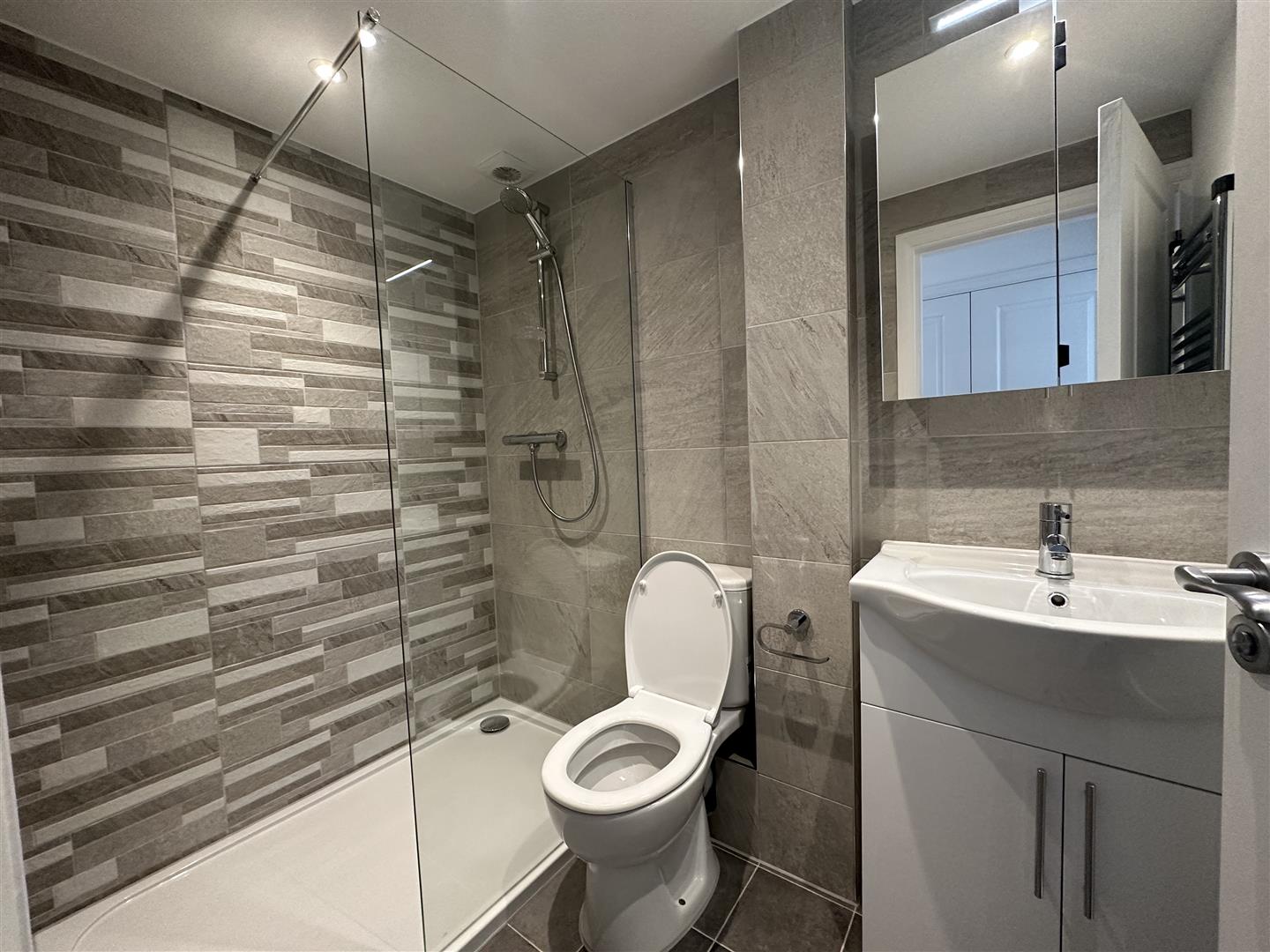 Stairs lead down to the bedroom and contemporary house bathroom with spacious shower.