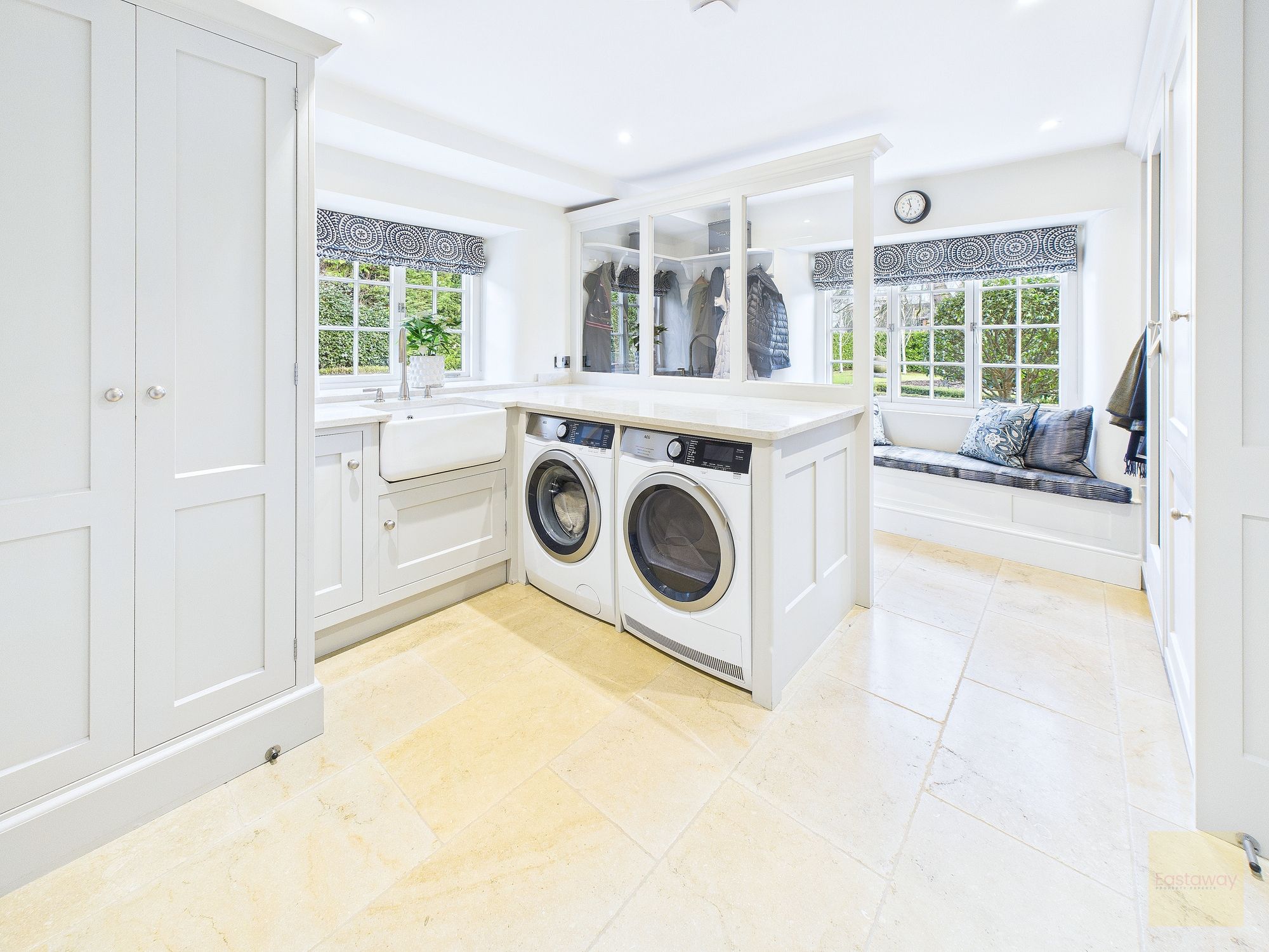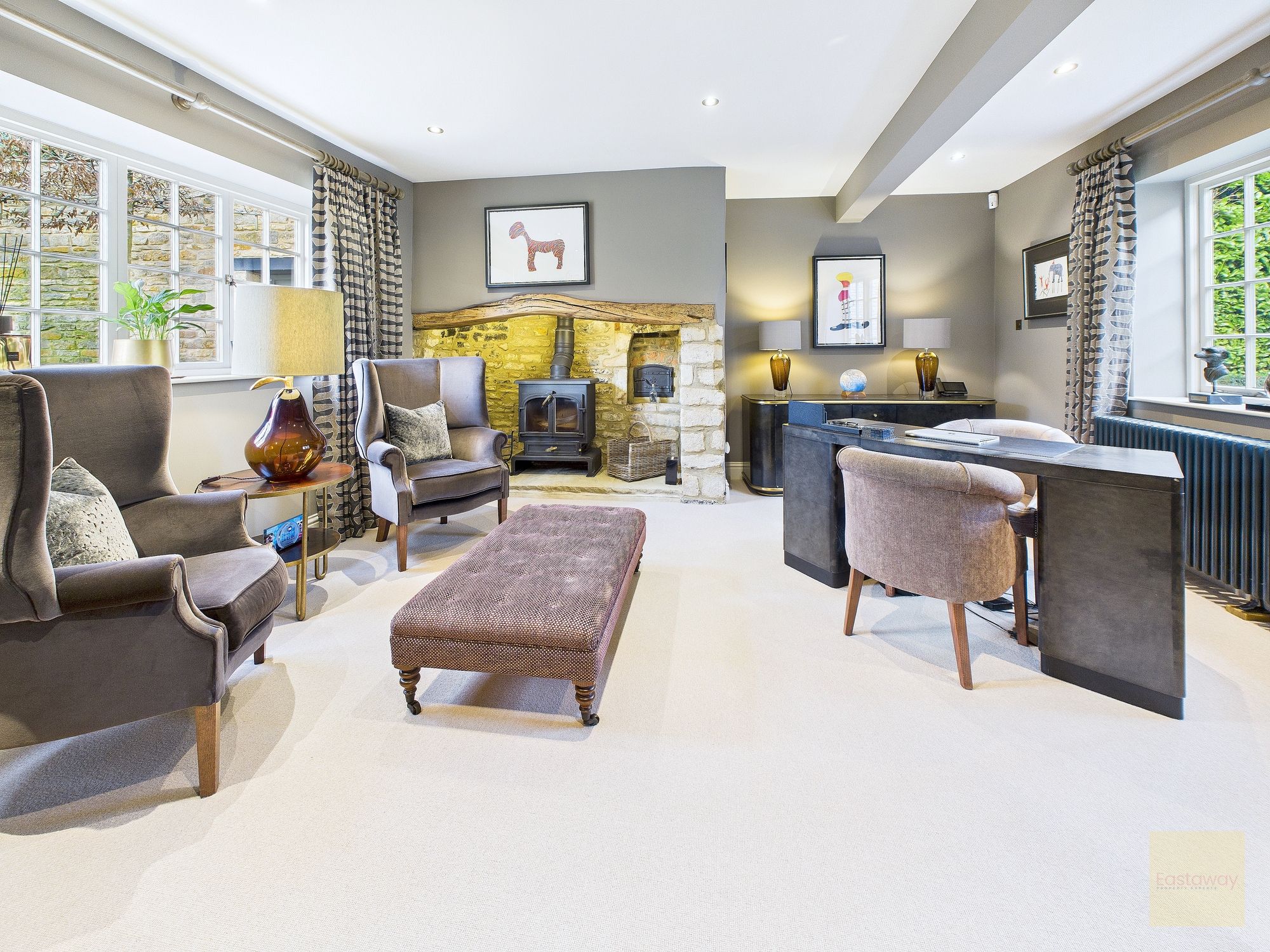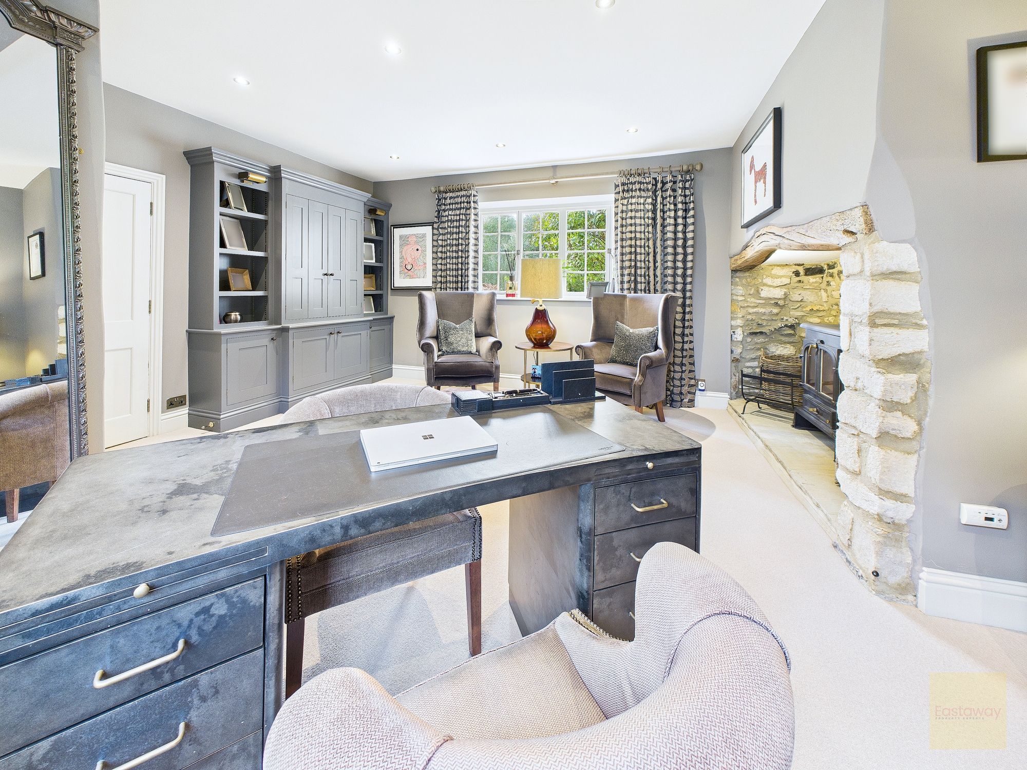 The ground floor is full of spaces that make everyday life feel easy. The main sitting room centres around a log burner and feels calm and comfortable, while the snug and the study each have their own wood burning stove, creating cosy retreats depending on the season or mood. There’s also a beautifully designed laundry and boot room that really stands out. With bespoke cabinetry, generous worktops, and even a built in window seat, it’s a practical space that feels every bit as considered as the rest of the house. A separate utility room and WC sit alongside, keeping the main living areas clutter free.