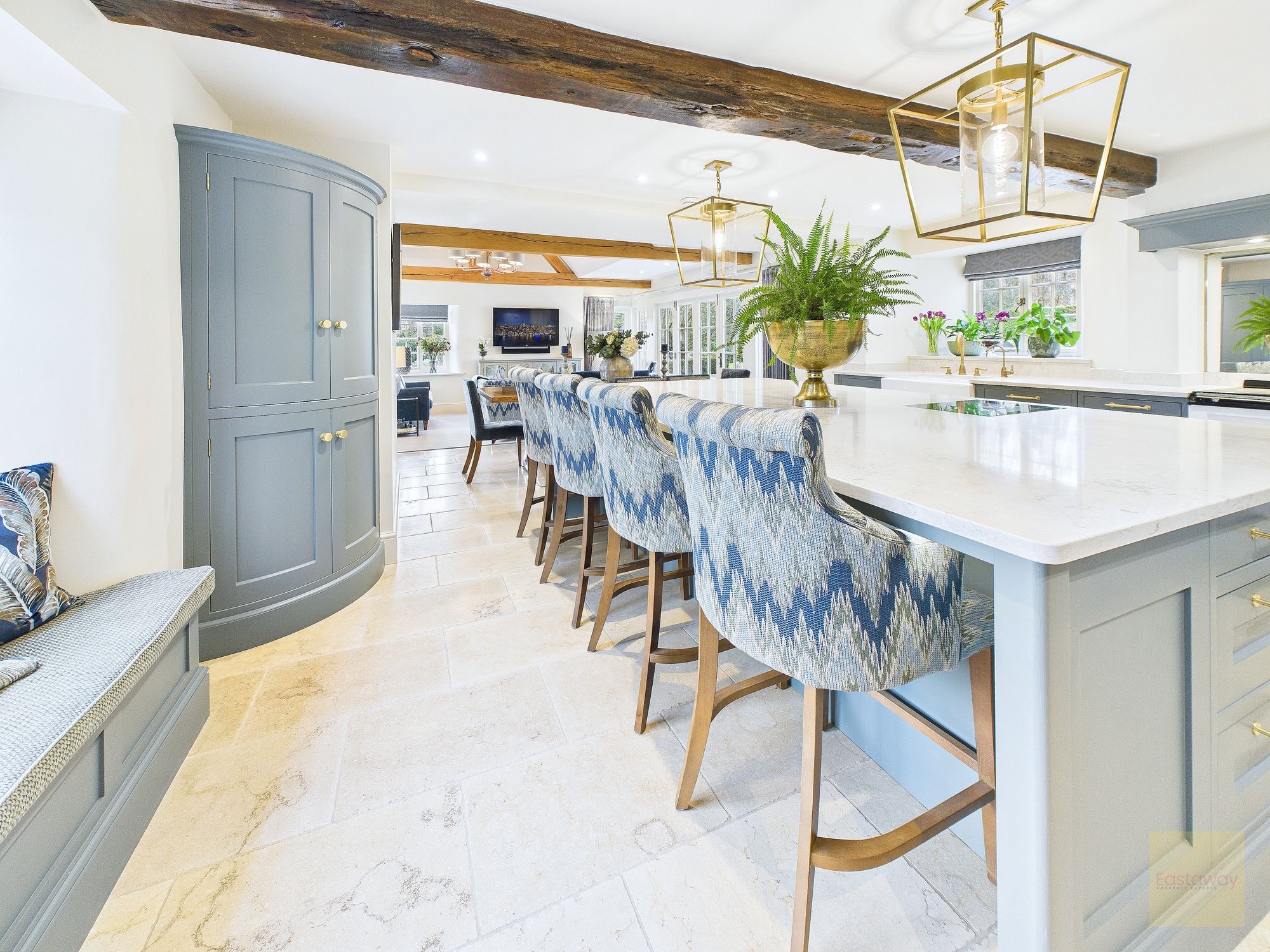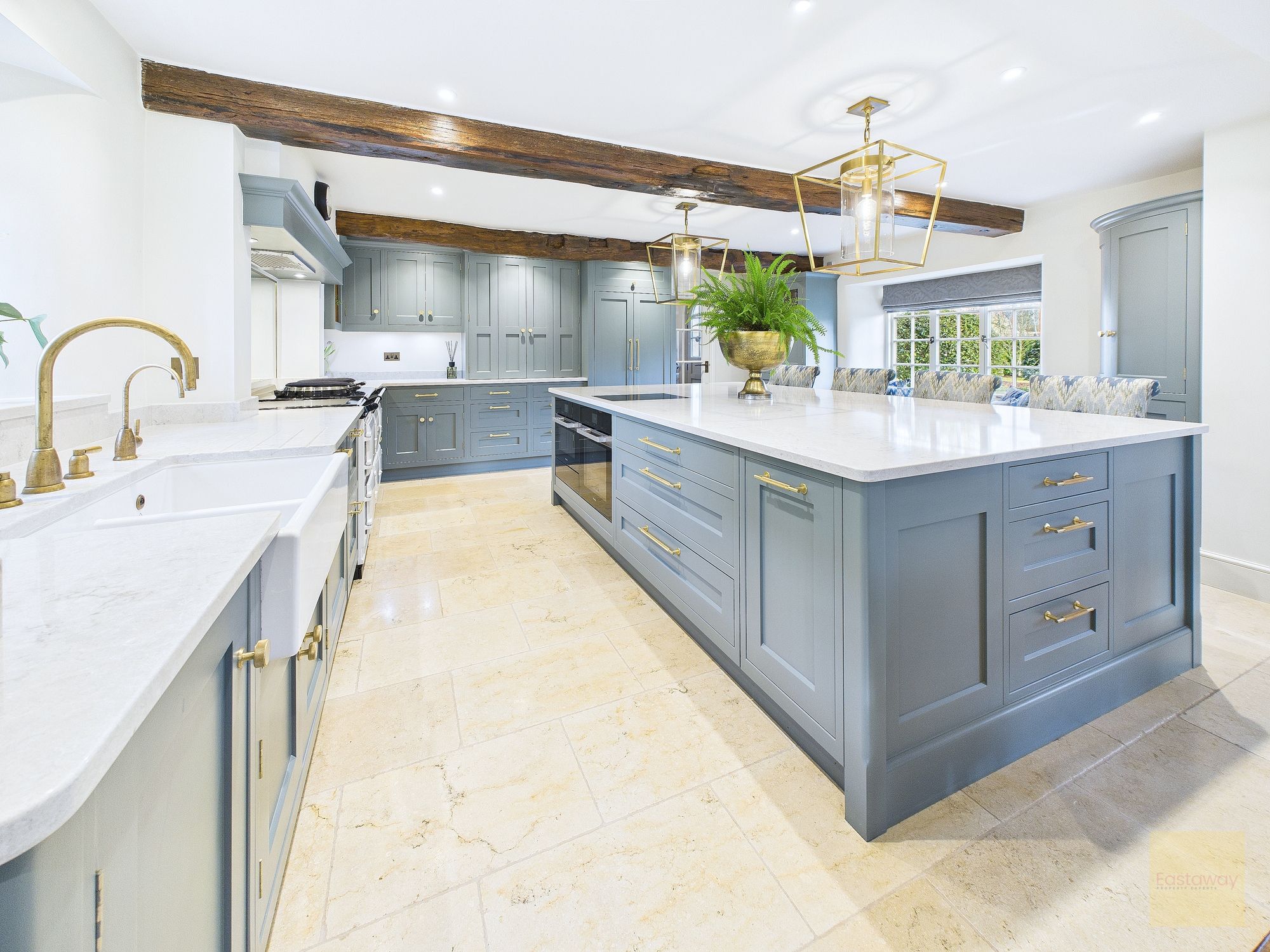 The kitchen sits at the heart of the home and really is a space you’ll gravitate towards. Handmade bespoke cabinetry by Wychwood Cabinet Makers, quartz worktops, Miele appliances, a Fisher and Paykel fridge, and a modern electric Aga combine to create a kitchen that’s as practical as it is impressive. Perrin and Rowe taps, limestone flooring, and exposed oak beams give it real presence, but it never feels like a showpiece. This is a kitchen designed to be used, shared, and enjoyed.