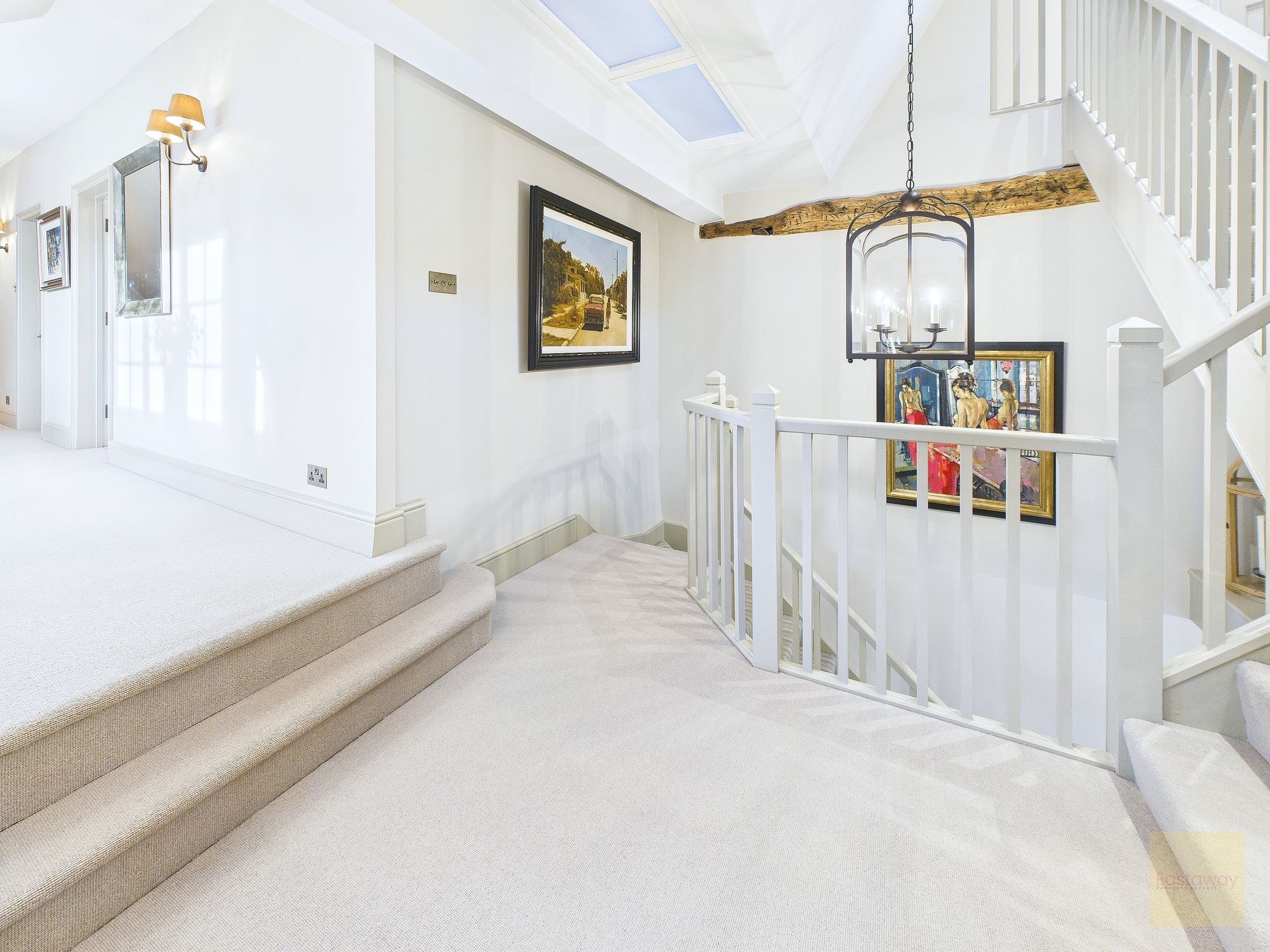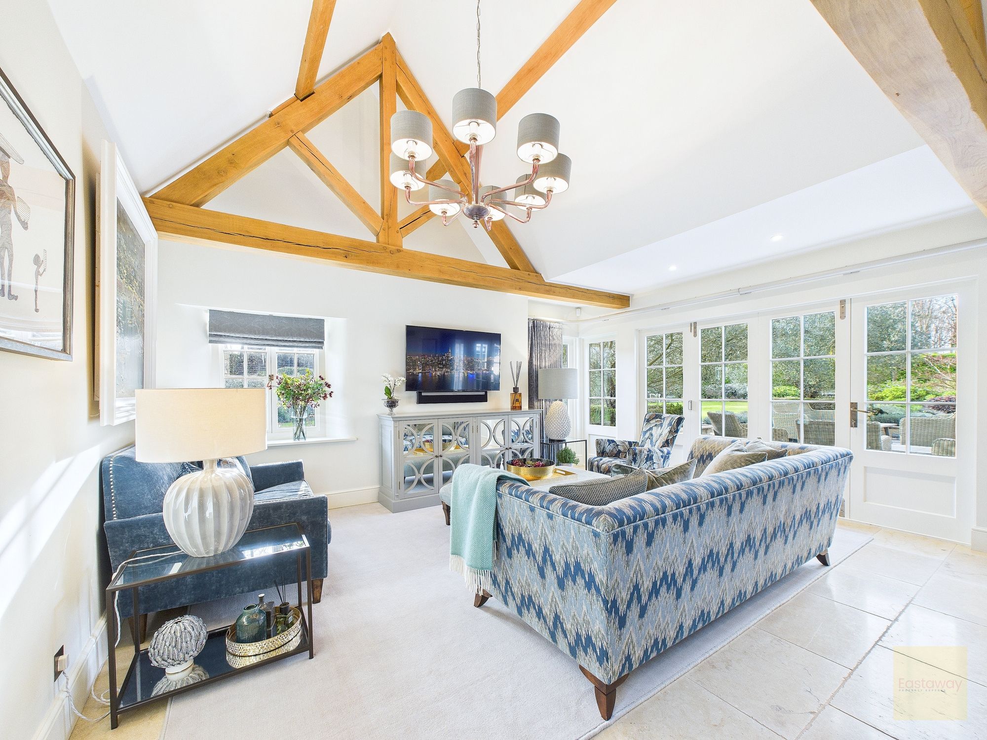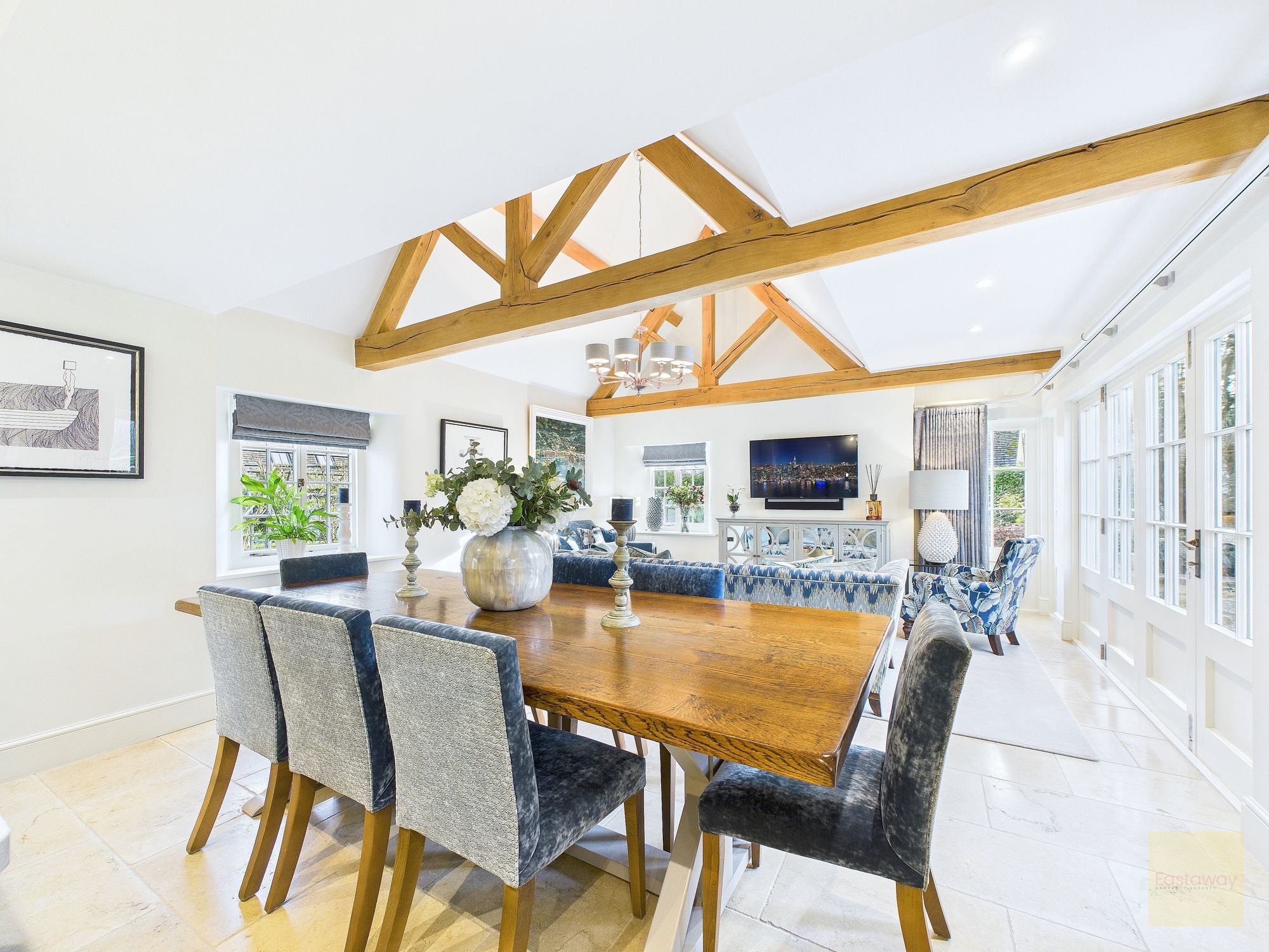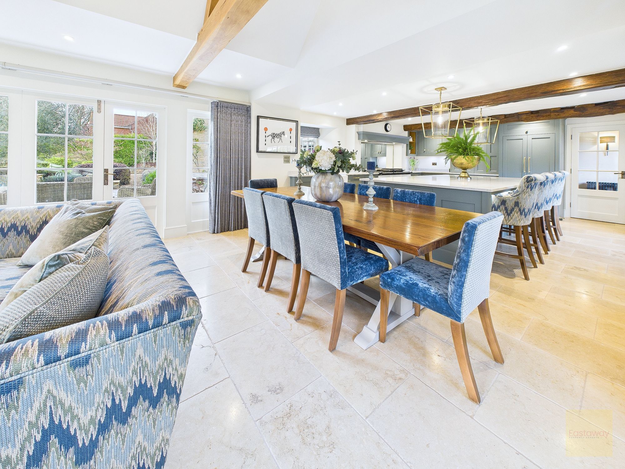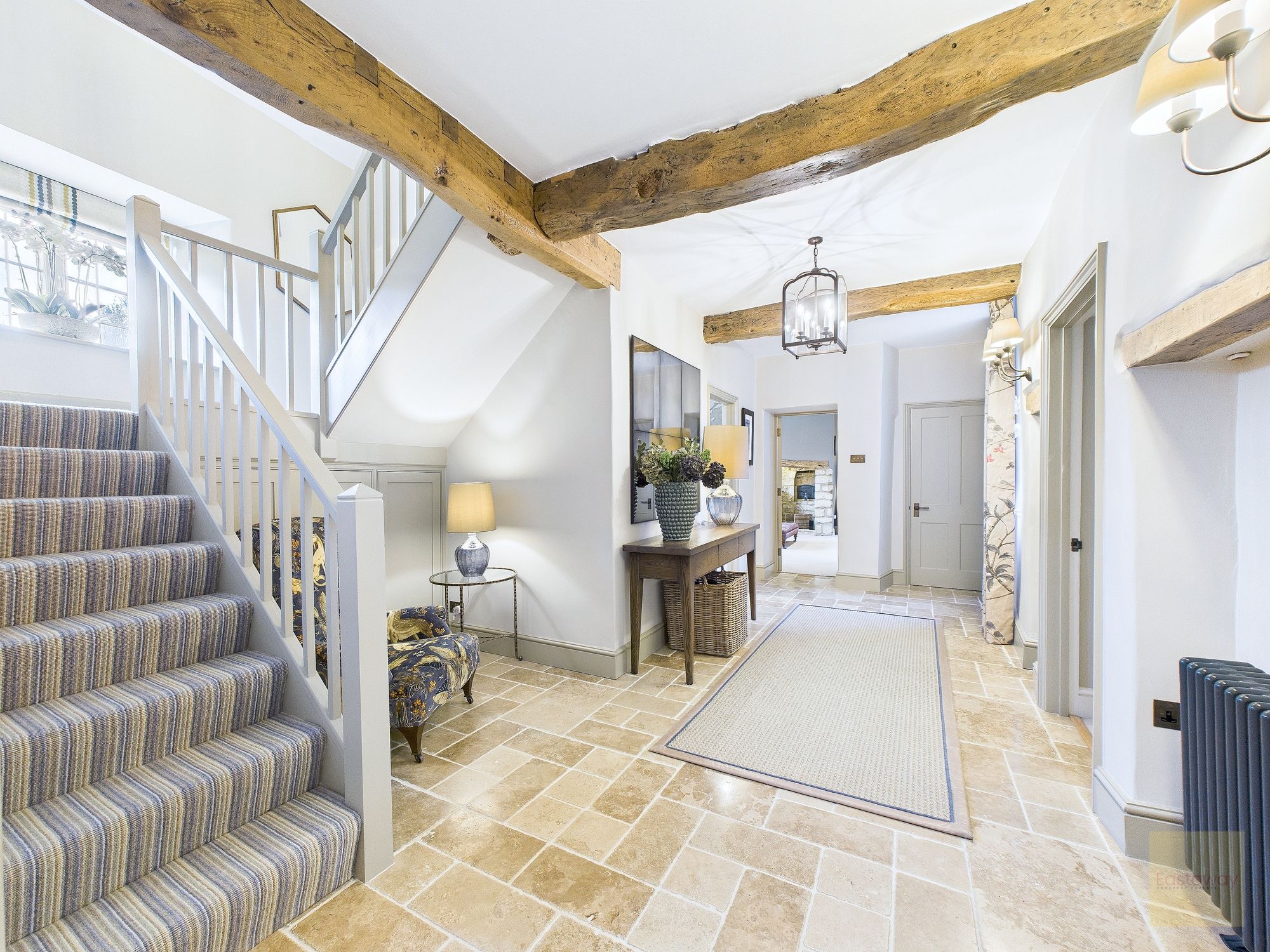 Inside, the atmosphere is warm and welcoming. Exposed beams, stripped back to their natural wood, run through the house. Light moves softly across limestone floors, oak hallways, and beautifully proportioned rooms. Nothing feels overdone. It all feels considered, calm, and effortlessly elegant.