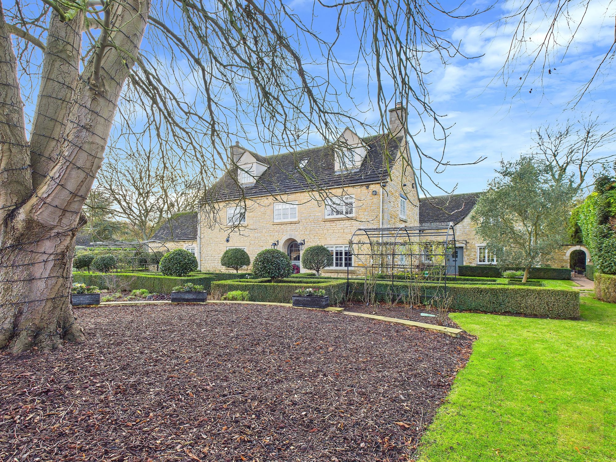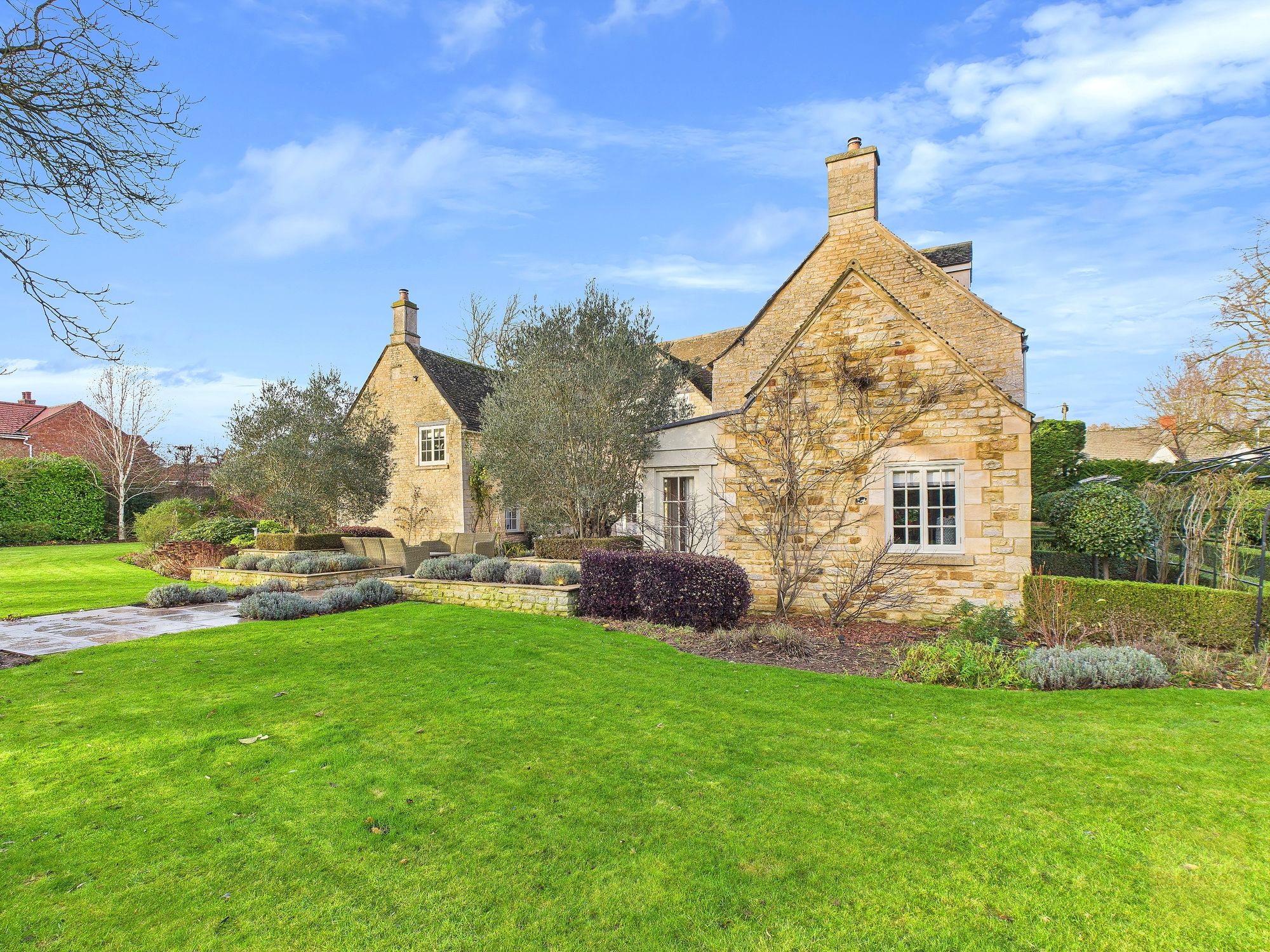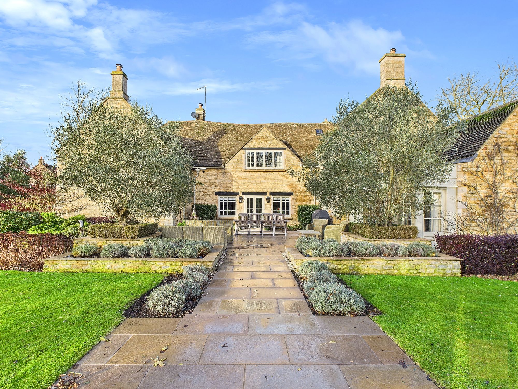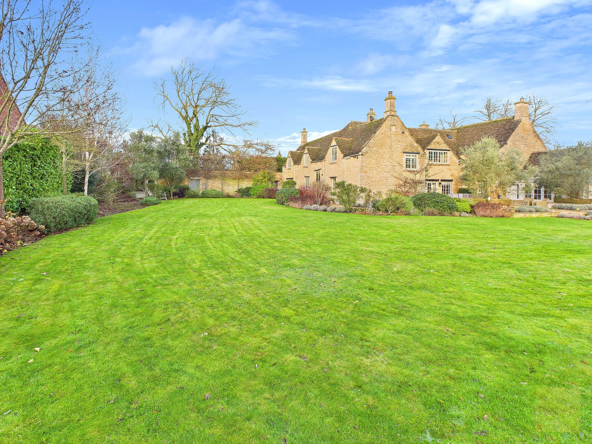 - Privately gated setting with stone walls and beautifully landscaped wraparound gardens