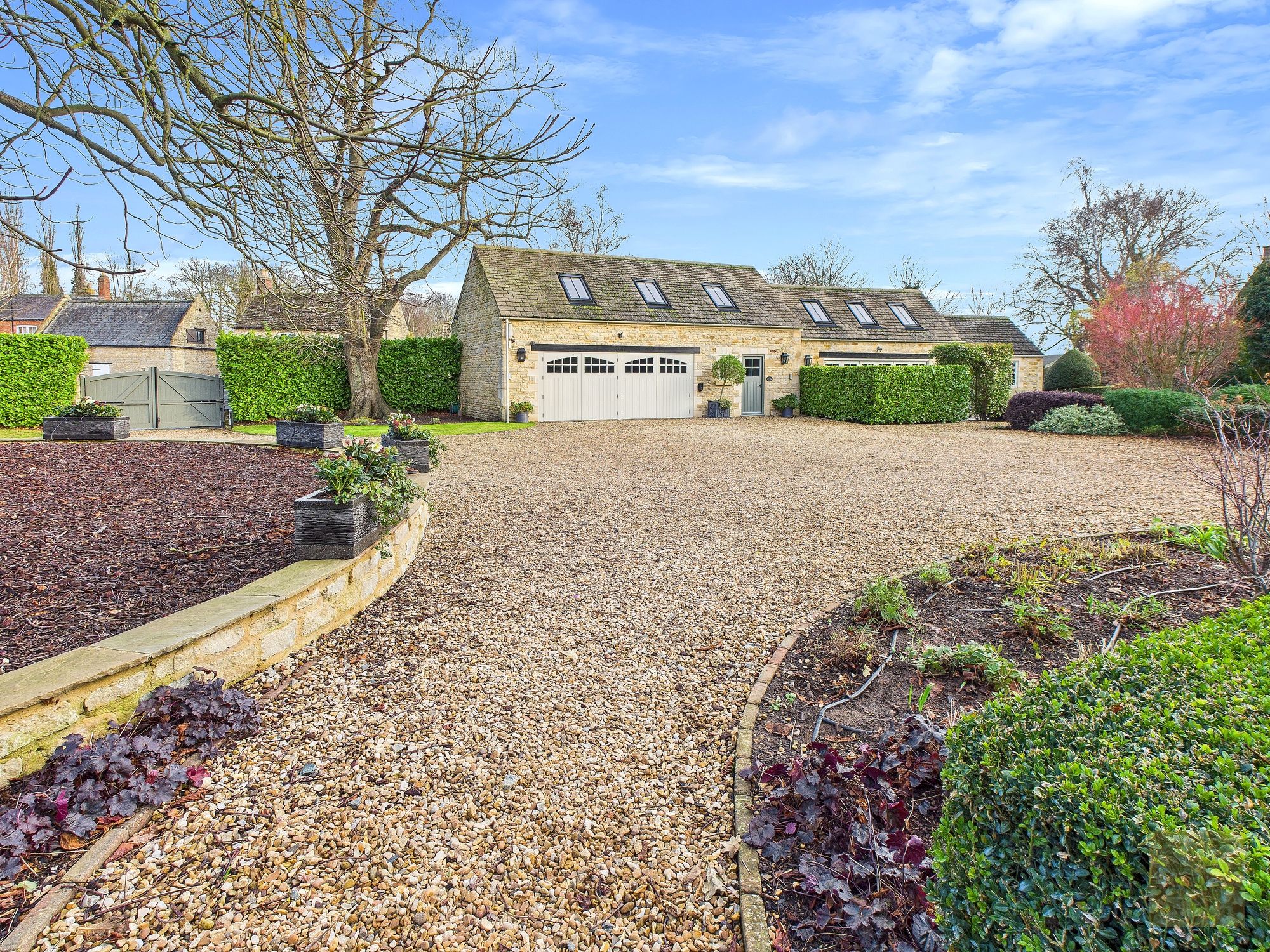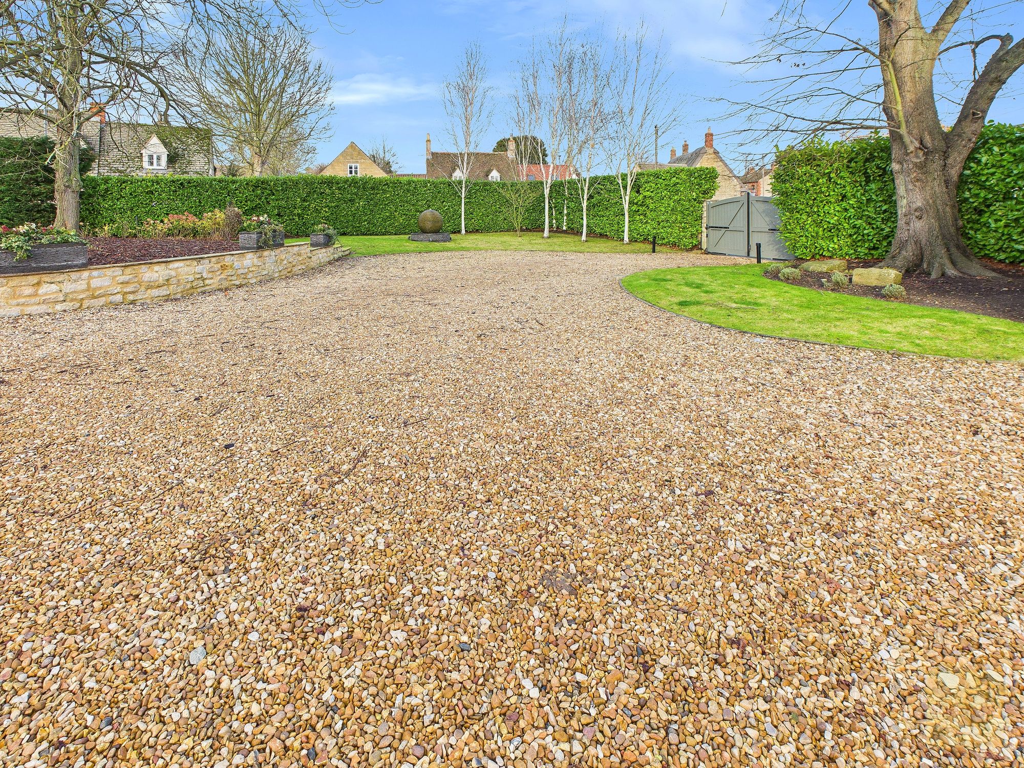 You arrive through electric wooden gates and immediately feel a sense of privacy and security. Stone walls wrap around the property, planting has been carefully designed to shield the house throughout most of the year, and the gravel driveway opens out in front of you with quiet assurance. This feels safe, settled, and discreet. The kind of place where your shoulders drop the moment you arrive home.