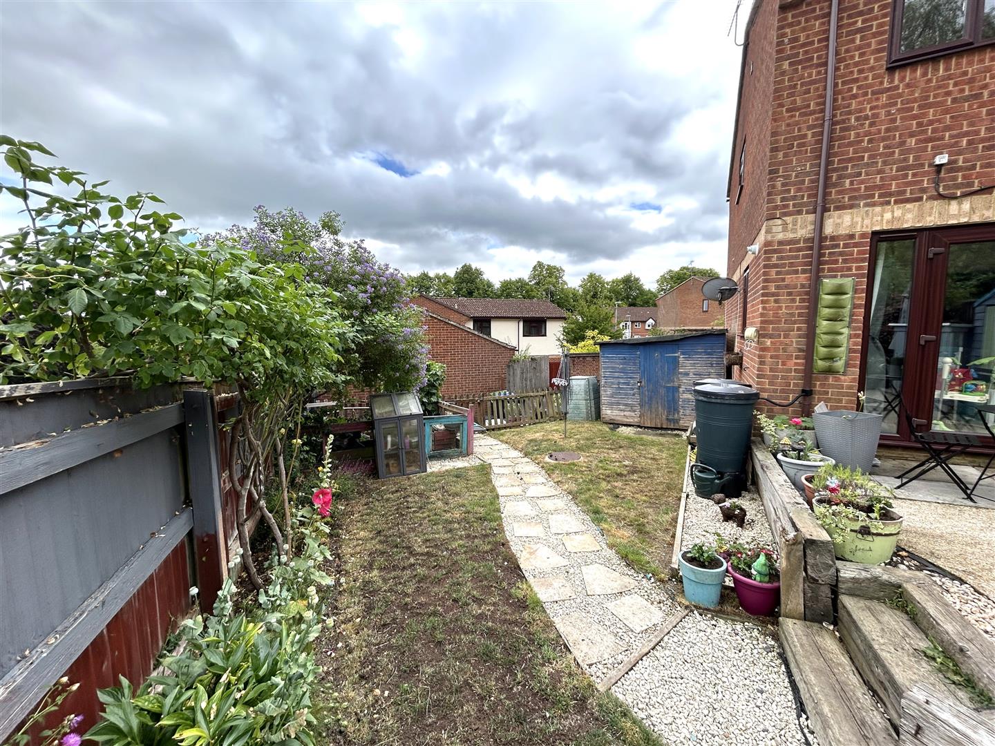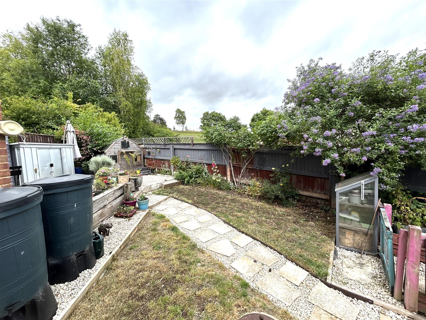 To the rear of the property is a mature garden split over two levels. It features a small grass area, a raised seating area, a shingle area, mature shrubbery and additional storage via two sheds.