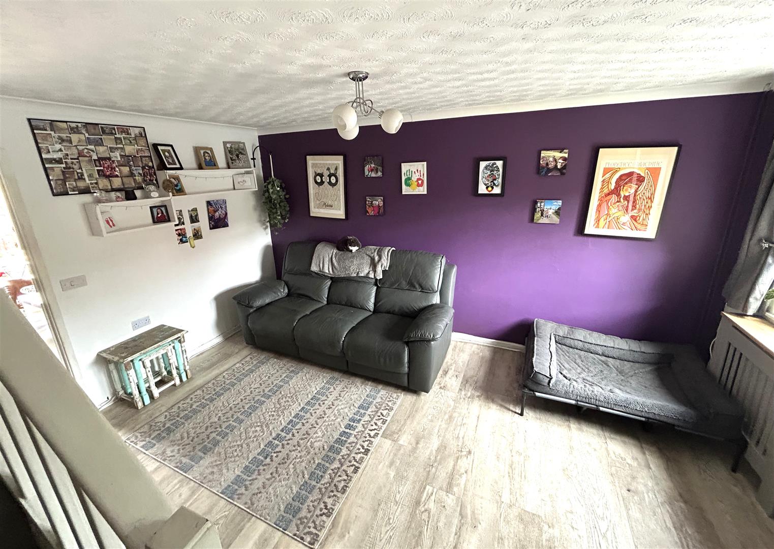 The living room has a coved and textured ceiling, as well as a staircase giving access to the first floor, and a double glazed window to front aspect. It also comprises a wall mounted radiator and a range of power points.