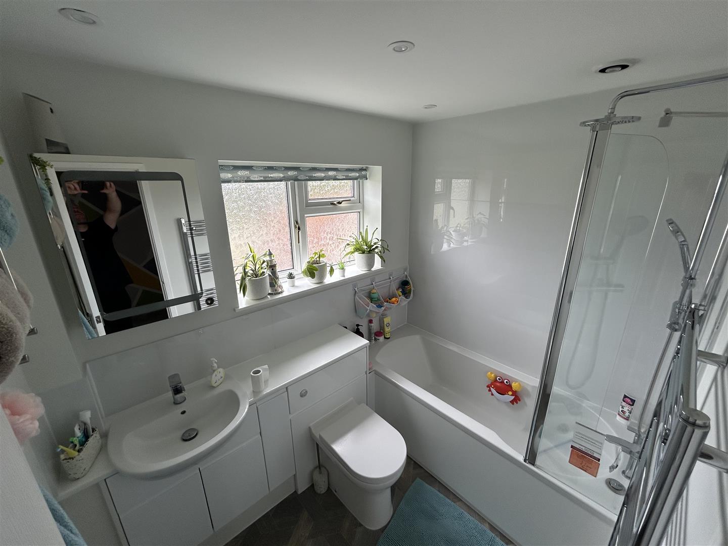 The modern three piece bathroom suite has a smooth ceiling with sunken light fittings, a double glazed frosted window to side aspect, and a heated towel rail. It features a bath inset with mixer tap over and power shower fitted above, a vanity unit with integrated wash hand basin and tap, and a low level WC.