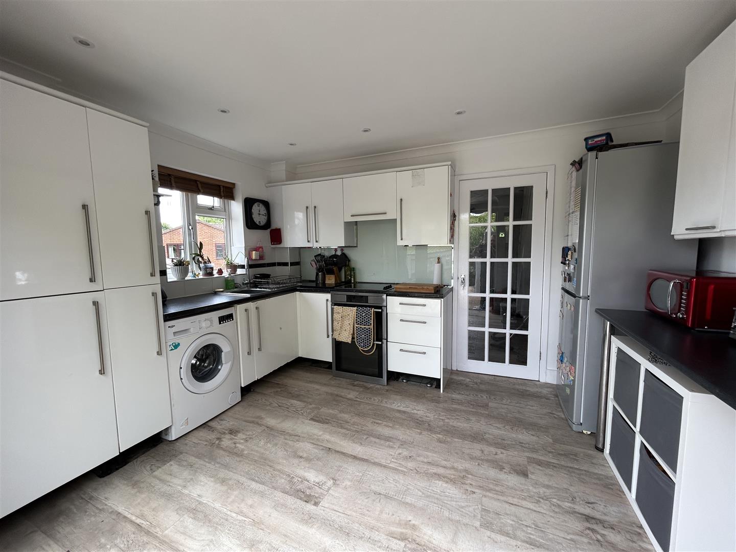 A glass door gives access from the living room to the kitchen diner. The kitchen diner features iron base level units with rolled edge work surfaces over, a single drainer stainless steel sink unit with mixer tap over, space for a fridge freezer, space and plumbing for a washer dryer, and an integrated oven and hob with extractor hood over. It also comprises a smooth ceiling with sunken light fittings, tiling to principle areas, a double glazed window to side aspect, a range of power points and double doors giving access to the rear garden.