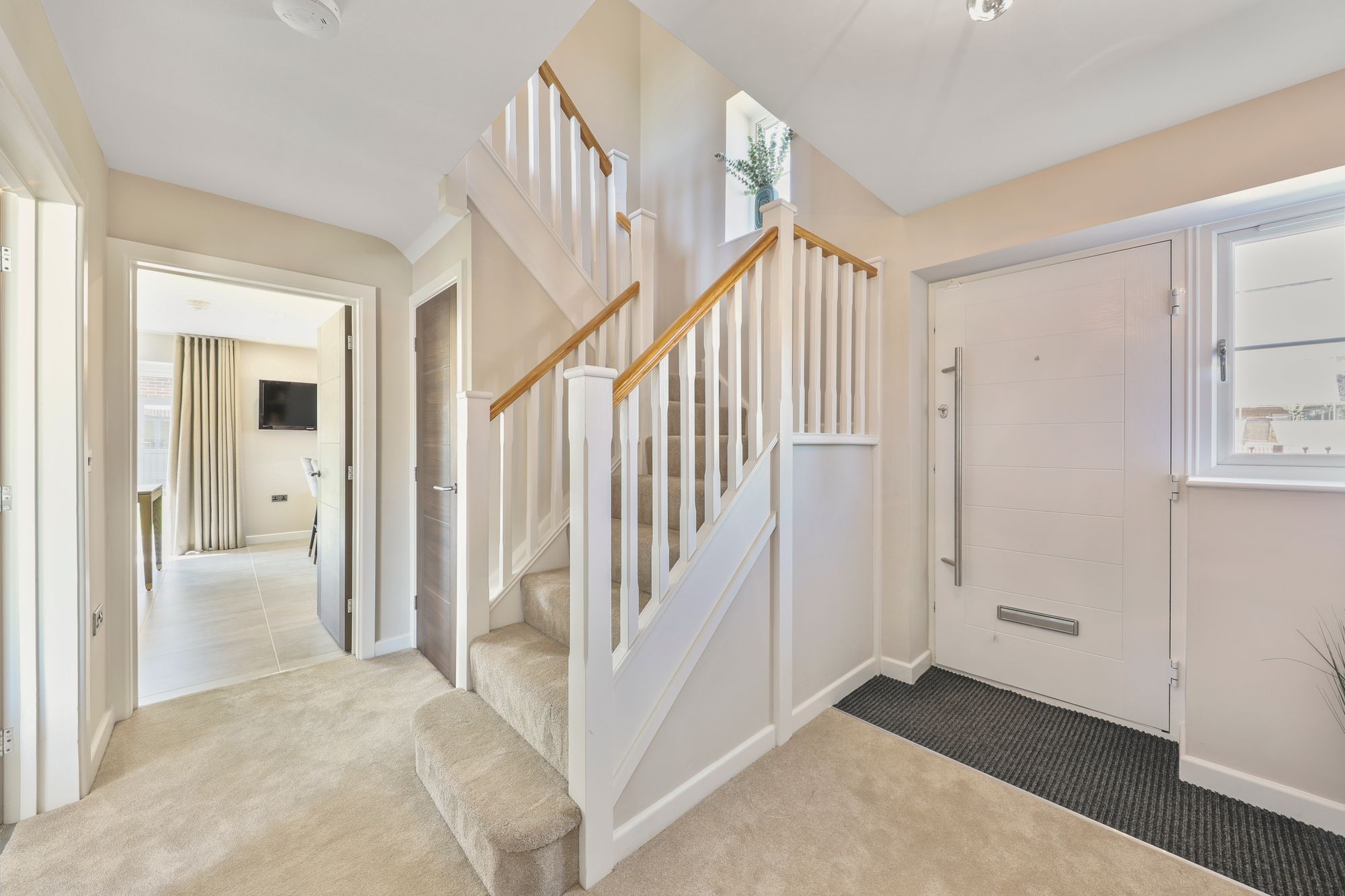 The property also features a larger-than-average driveway, offering ample parking for multiple vehicles alongside a single garage for added convenience and storage. Designed with sustainability in mind, the home includes a car charging point and solar panels for improved energy efficiency.