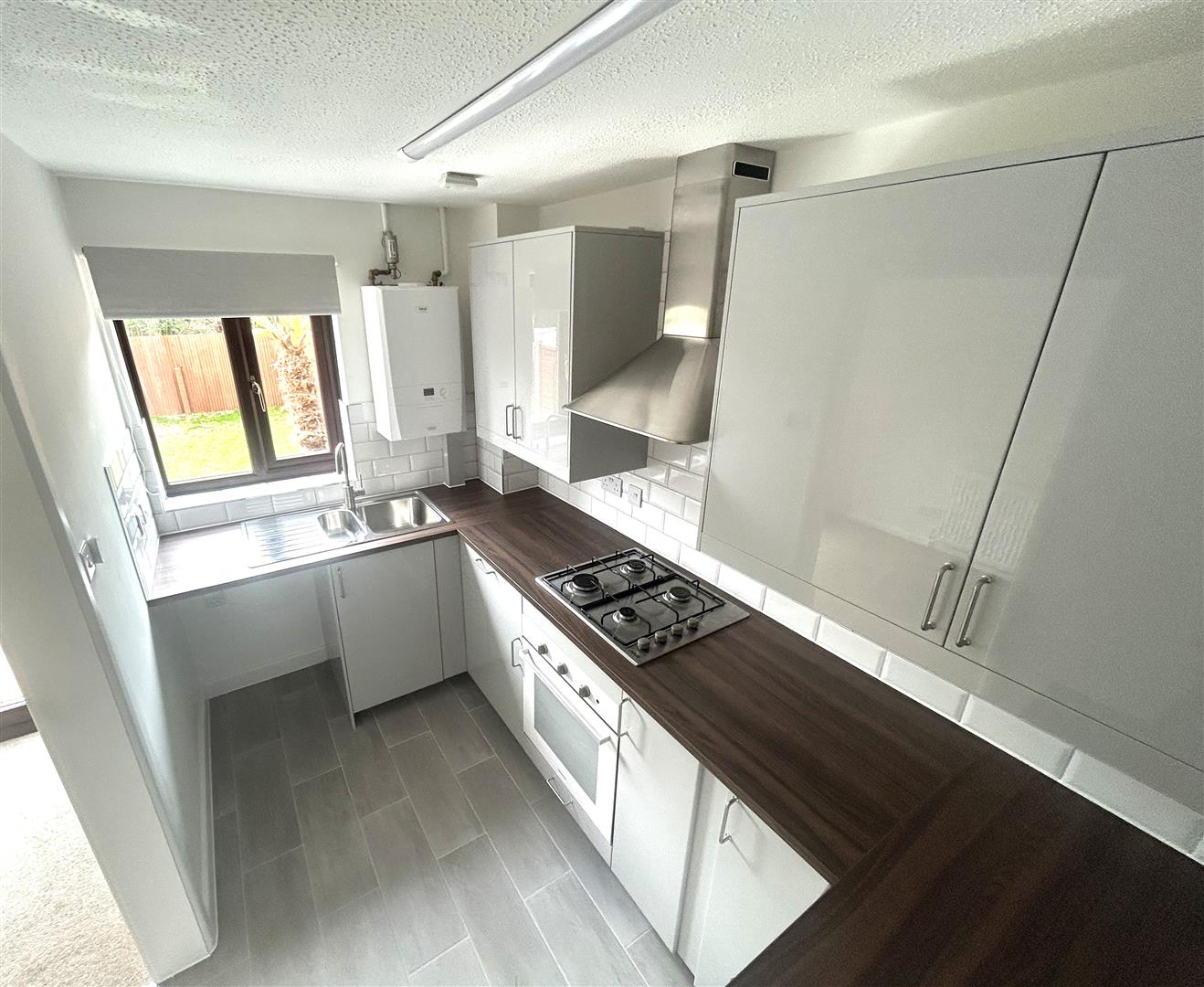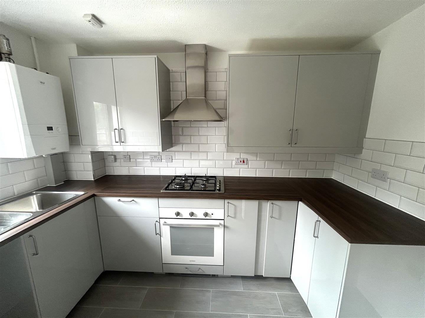 Fitted kitchen comprising of eye and base level units with roll edge work surfaces over. Stainless steel single drainer sink unit with mixer tap over. Built-in oven and hob. Space for fridge/freezer. Space for washing machine. Wall mounted Glow-worm boiler. Double glazed window to rear aspect. Tiling to principle areas.