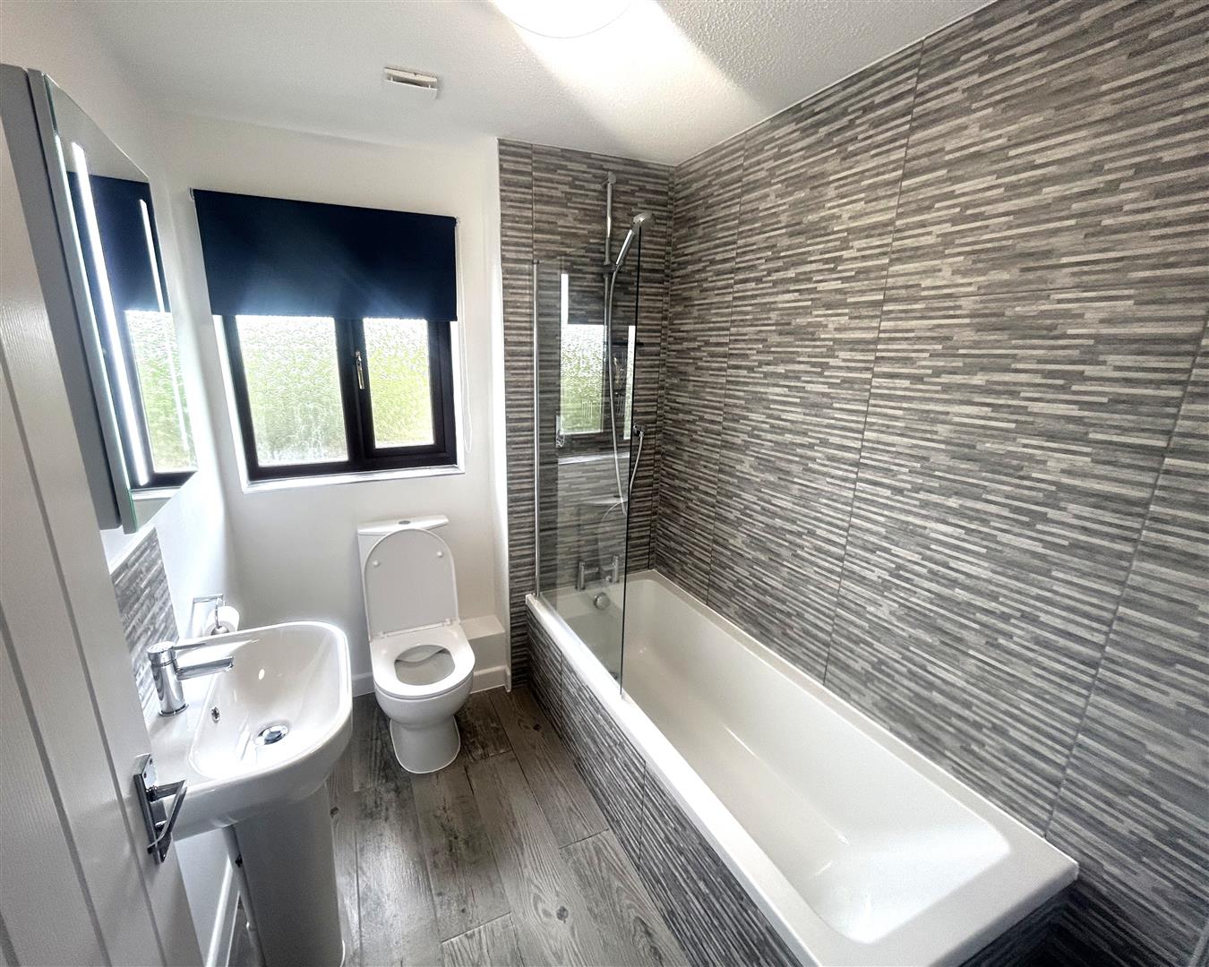3-piece bathroom suite comprising of low level W.C. Pedestal wash hand basin. Inset bath with mixer taps over. and shower attachment fitted. Double glazed frosted window to rear aspect. Tiling to principle areas.