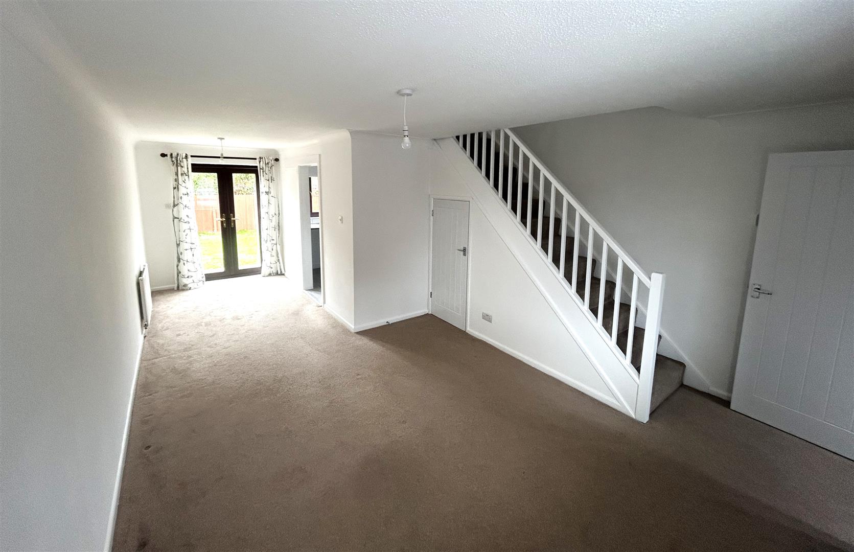 Coved and textured ceiling. Staircase to first floor. Under stairs storage cupboard. 2 x Wall mounted radiators. Double glazed box window to front aspect. Range of power points. Fuse box. Thermostat control. Patio doors giving access to rear garden. Sliding door to: