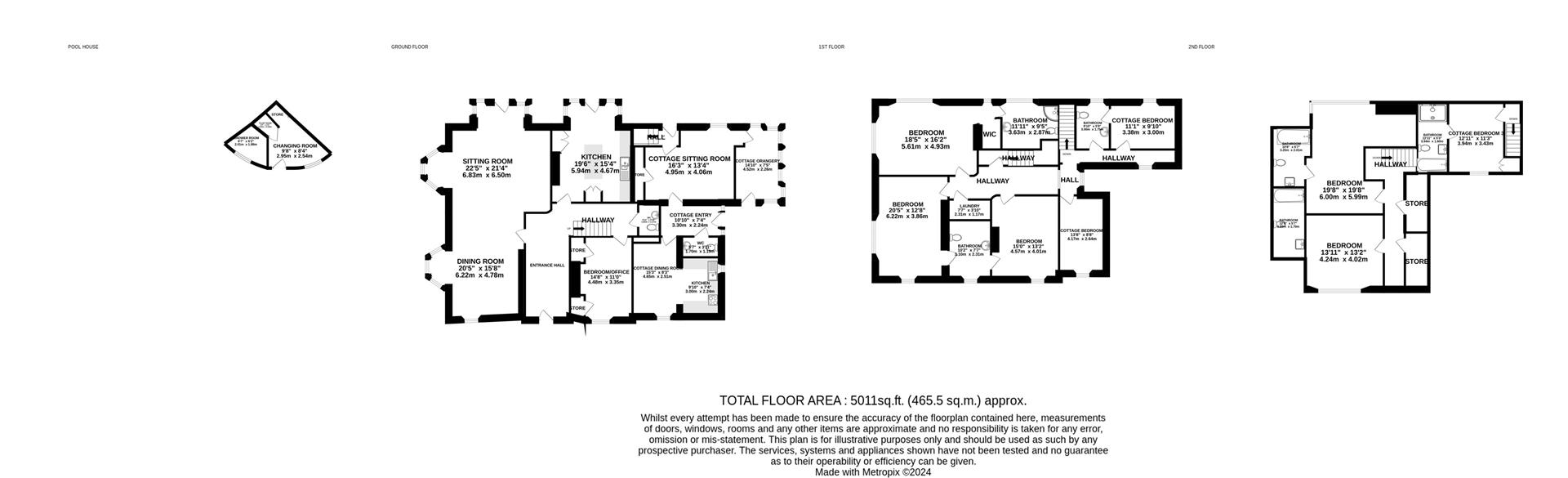 Externally, there is a decked terrace with a large sunken swim spa and pool house with showers and changing facilities. The perfect place for al-fresco dining or to simply enjoy the garden views