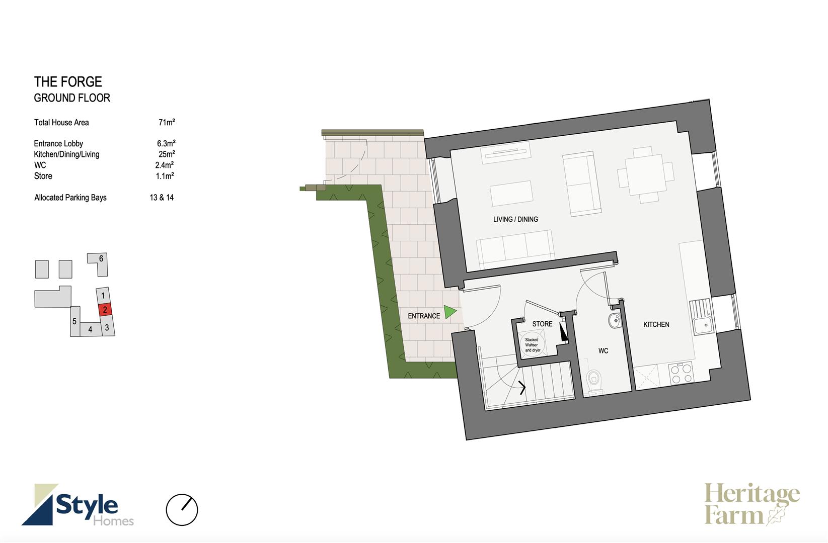 The Forge is a beautifully designed two-bedroom home that blends character and comfort. Upon entering, you are welcomed into a bright hallway featuring a convenient WC and store room with a staircase leading to the first floor.