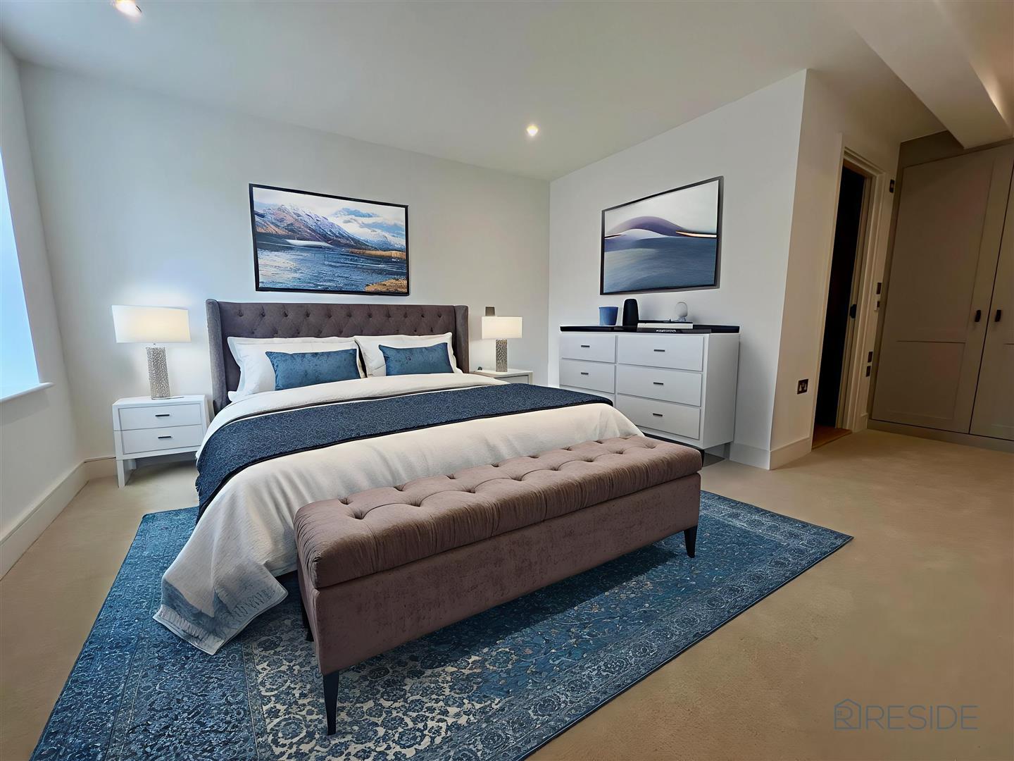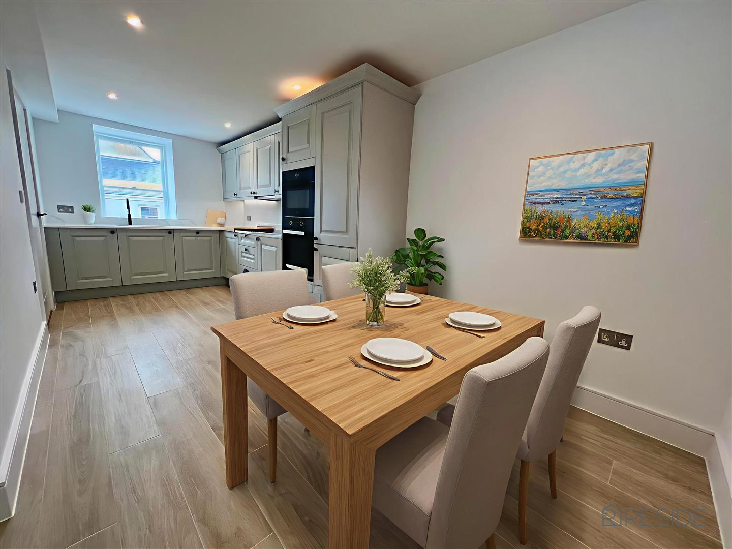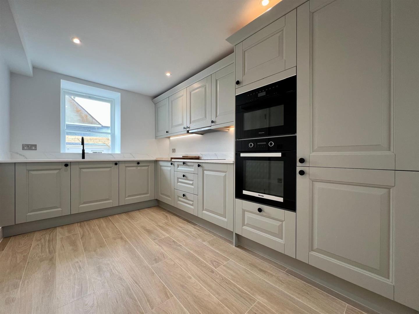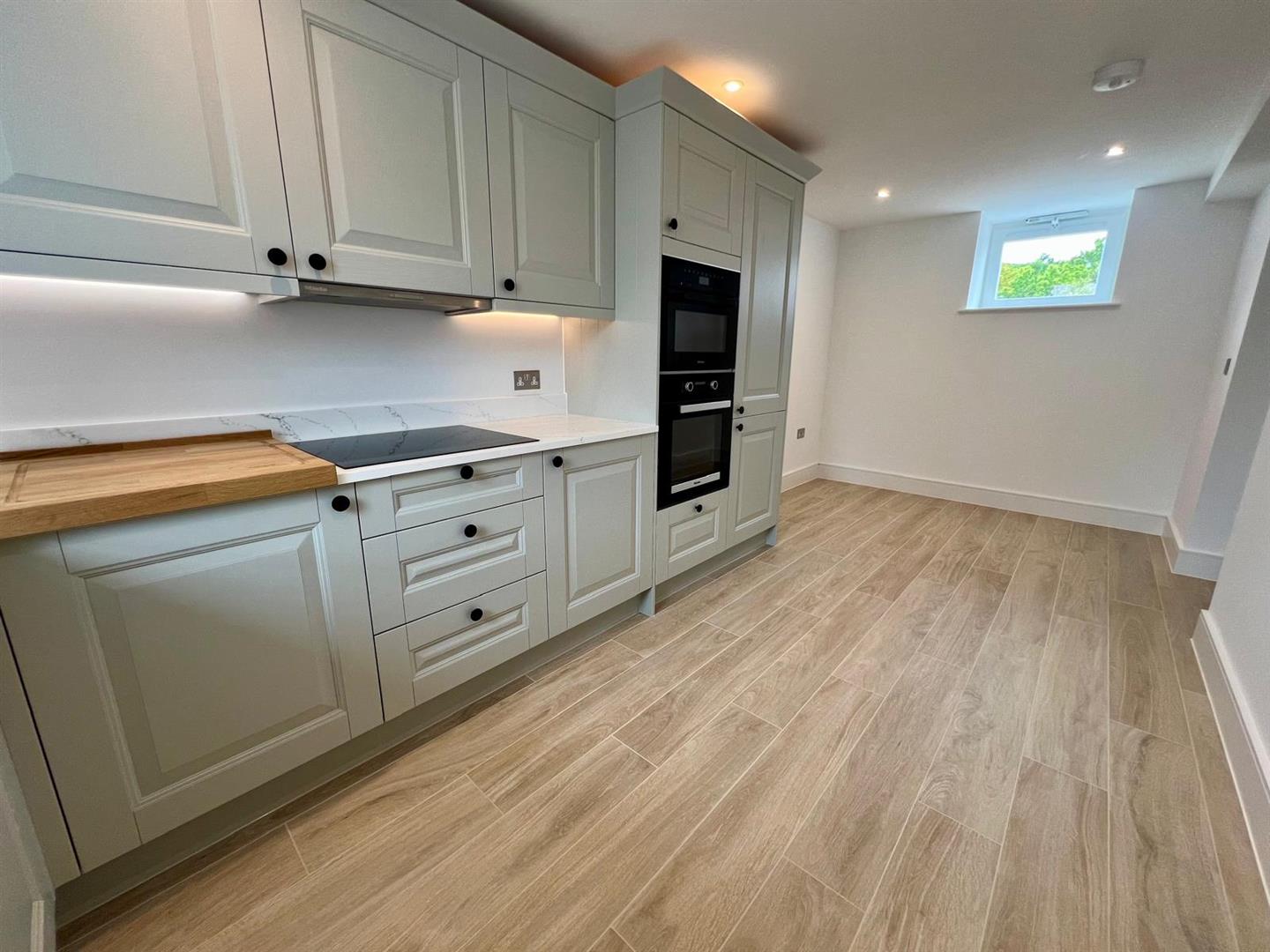 The heart of the home is the spacious open-plan kitchen and dining area, completed with Laura Ashley Kitchen, high-spec Miele appliances, and elegant Pietra worktops. There is also a separate living area featuring large windows.