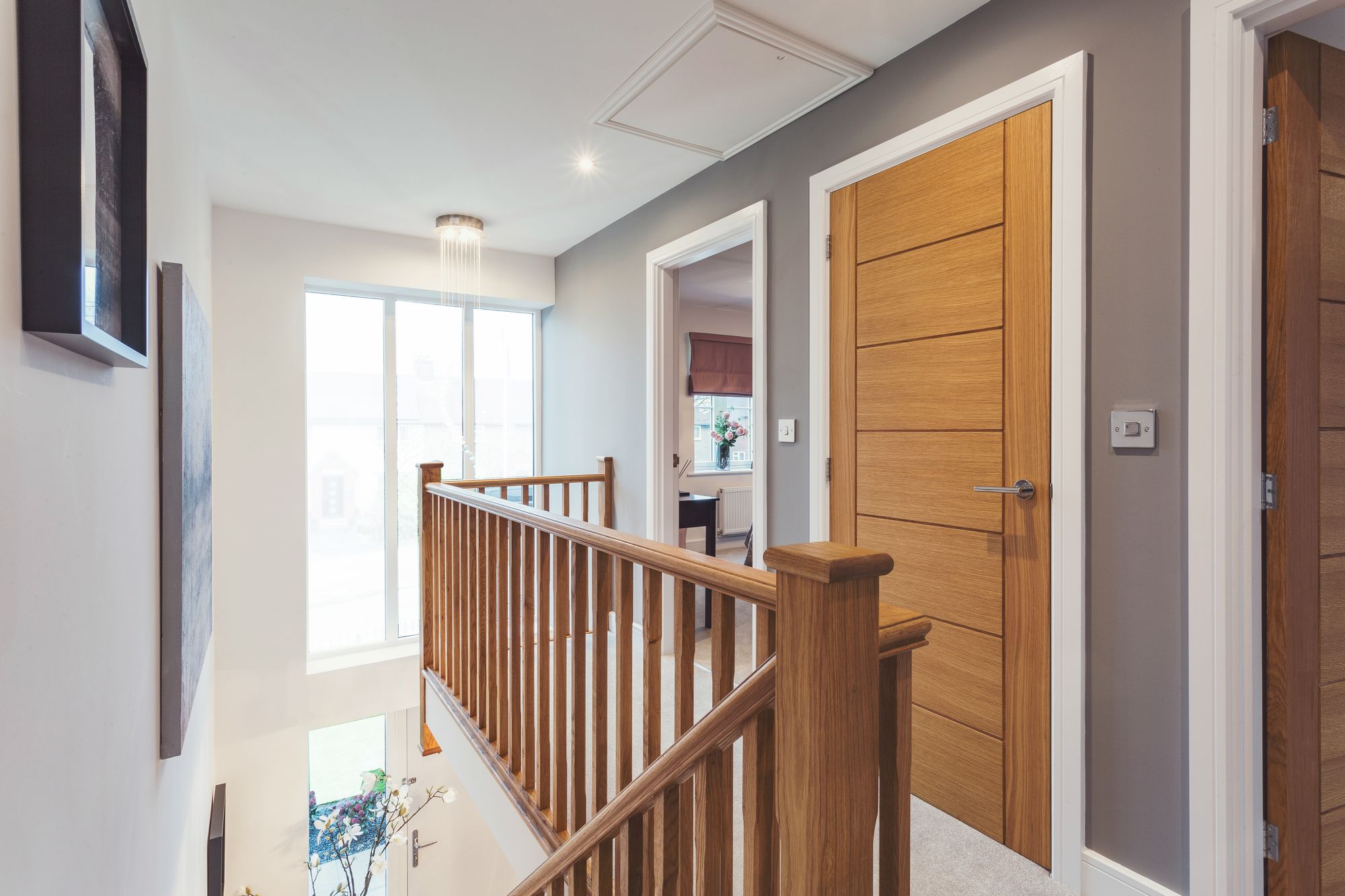 Plot 17, The Winchester. This contemporary four bedroom detached new home in Stretton features an impressive full-height entrance hall which feature double-height glazed windows that lead to an open plan family living, kitchen and dining area with bi-fold doors that lead to the outside space. It also includes a downstairs toilet, a utility room, a large lounge and a good sized study or playroom. The first floor offers a spacious family bathroom, four great-sized bedrooms including the master bedroom with a very generous ensuite, all finished with luxury fixtures and fittings. An oak staircase and elegant internal oak doors are standard and show off the high quality finish and craftsmanship of every Meadowview Home. There is an integral single garage and the gardens are landscaped to the front and rear of the house.