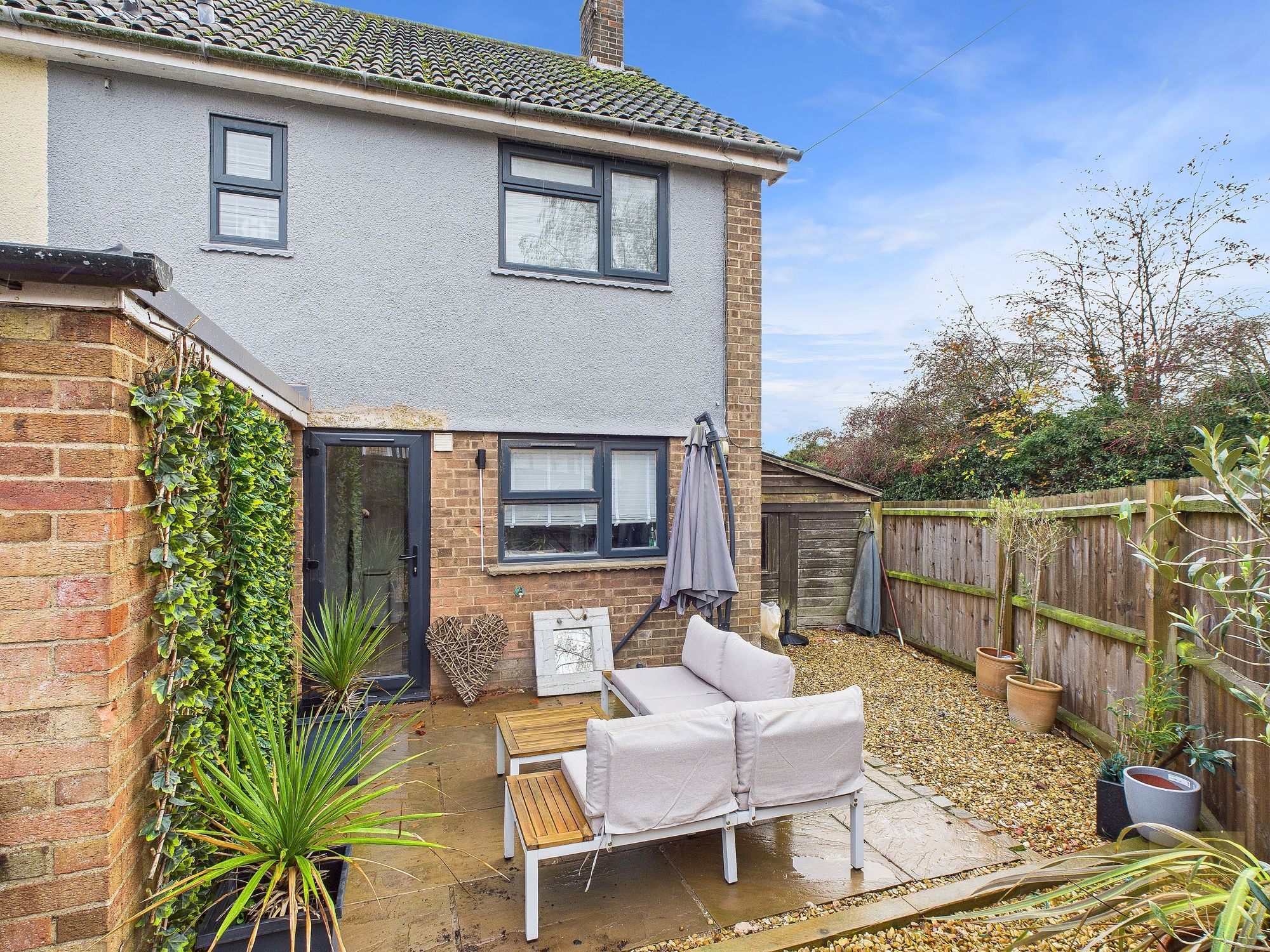 The rear garden is enclosed and low maintenance with a mix of patio and gravel that gives you space to sit out and enjoy the warmer months. There is also a large shed to the side for extra storage or hobbies. This shed could easily be removed providing ample space to extend the property itself, subject to relevant planning permissions. At the front, the gravel driveway offers parking, which is a real advantage when living this close to town.